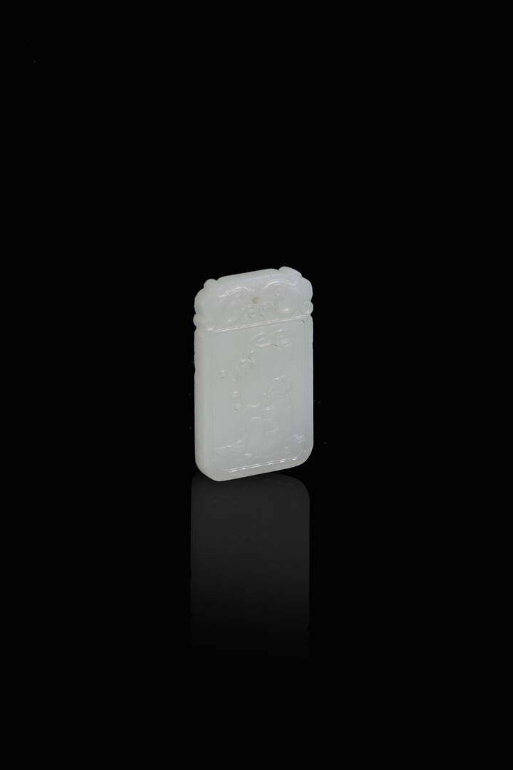 Placca in giada bianca incisa con iscrizioni e saggio Cina Repubblica XX sec. H cm 5x3