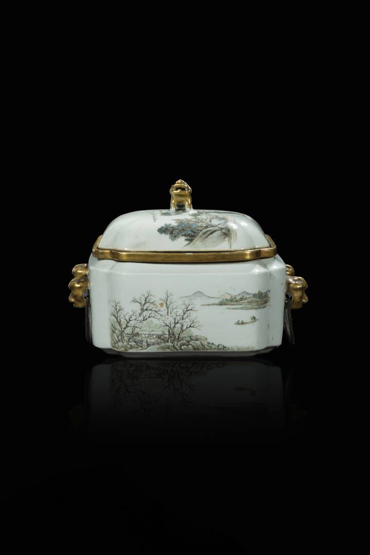 Scaldavivande in porcellana Famiglia Rosa decorato con paesaggio Cina dinastia Qing marca Guangxu (1875-1908) H cm 17x22