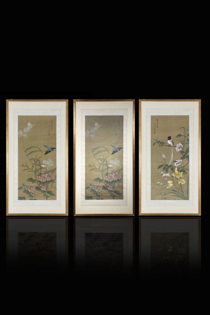 Tre dipinti su pergamena raffiguranti uccello su ramo in fiore con iscrizioni Cina Repubblica XX sec. H cm 96x45 ciascuno