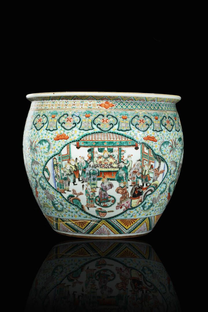 Vasca in porcellana Famiglia Verde decorata con scene di corte entro riserve Cina Repubblica XX sec. H cm 40 5 Diam cm 47