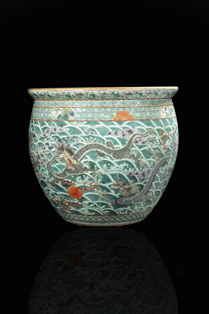 Vasca per pesci in porcellana Famiglia Verde decorata con draghi tra le onde Cina dinastia Qing epoca Guangxu (1875-1908) H cm 41 Diam cm 46