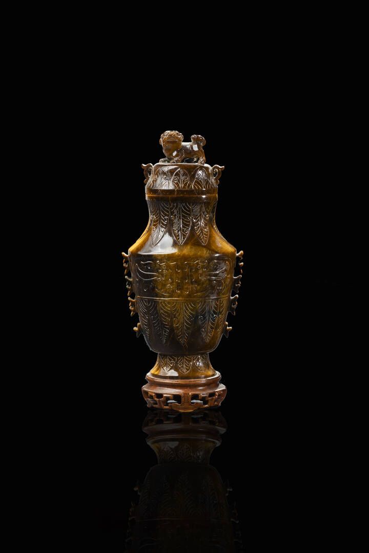 Vasetto in dente di tigre con decori floreali sormontato da cane di Pho Cina Repubblica XX sec. H cm 20x10