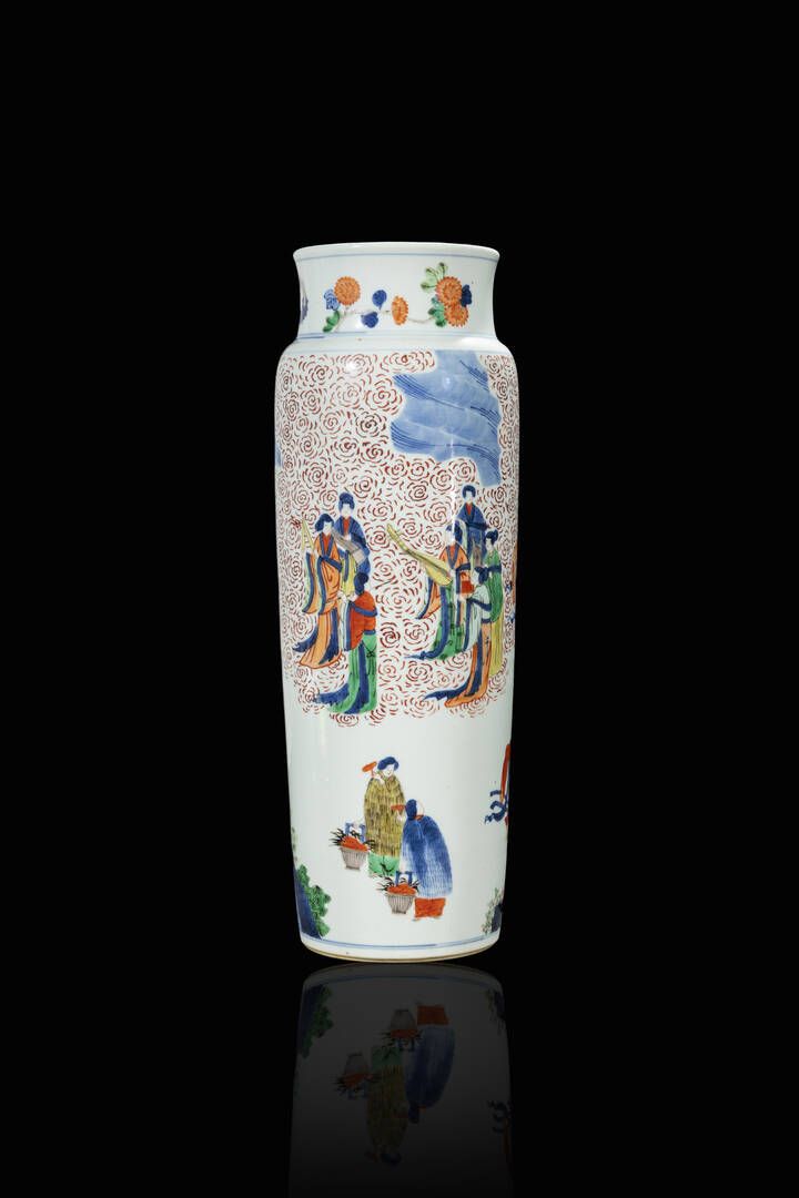 Vaso a cilindro in porcellana Wucai dipinta con personaggi Cina Repubblica XX sec. H cm 41 5 Diam cm 14