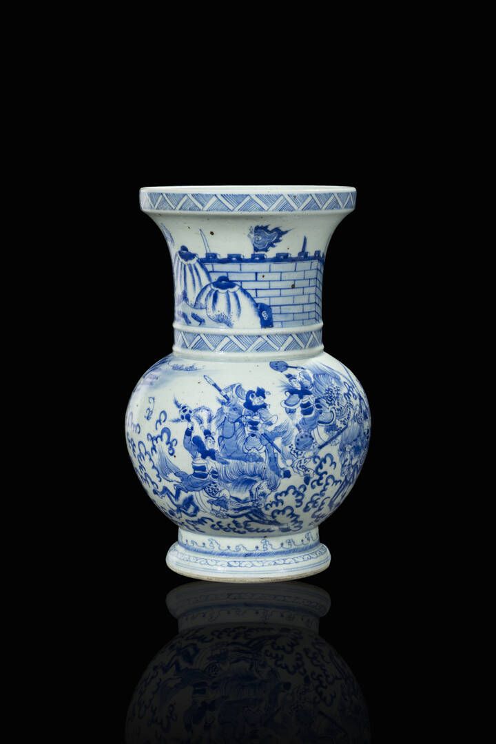 Vaso in porcellana bianca e blu dipinto con scene di battaglia Cina Repubblica XX sec. H cm 33 Diam cm 20
