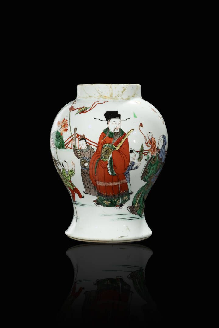 Vaso in porcellana Famiglia Verde decorato con dignitari Cina dinastia Qing XIX sec. H cm 25 Diam cm 19
