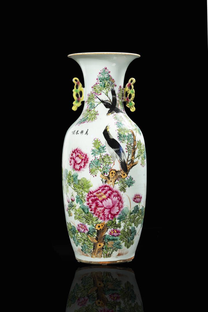 Vaso in porcellana policroma decorato con uccelli e peonie Cina Repubblica XX sec. H cm 59 Diam cm 21