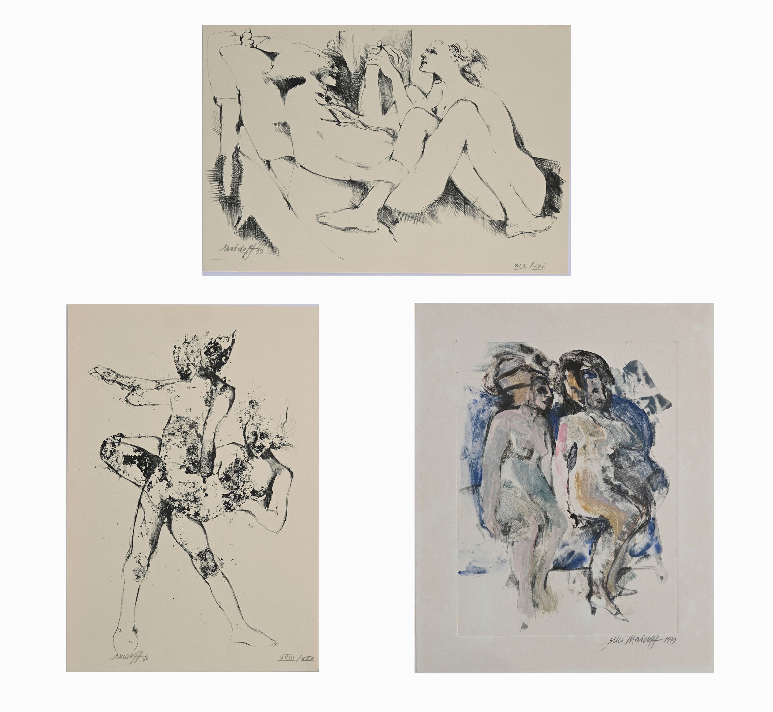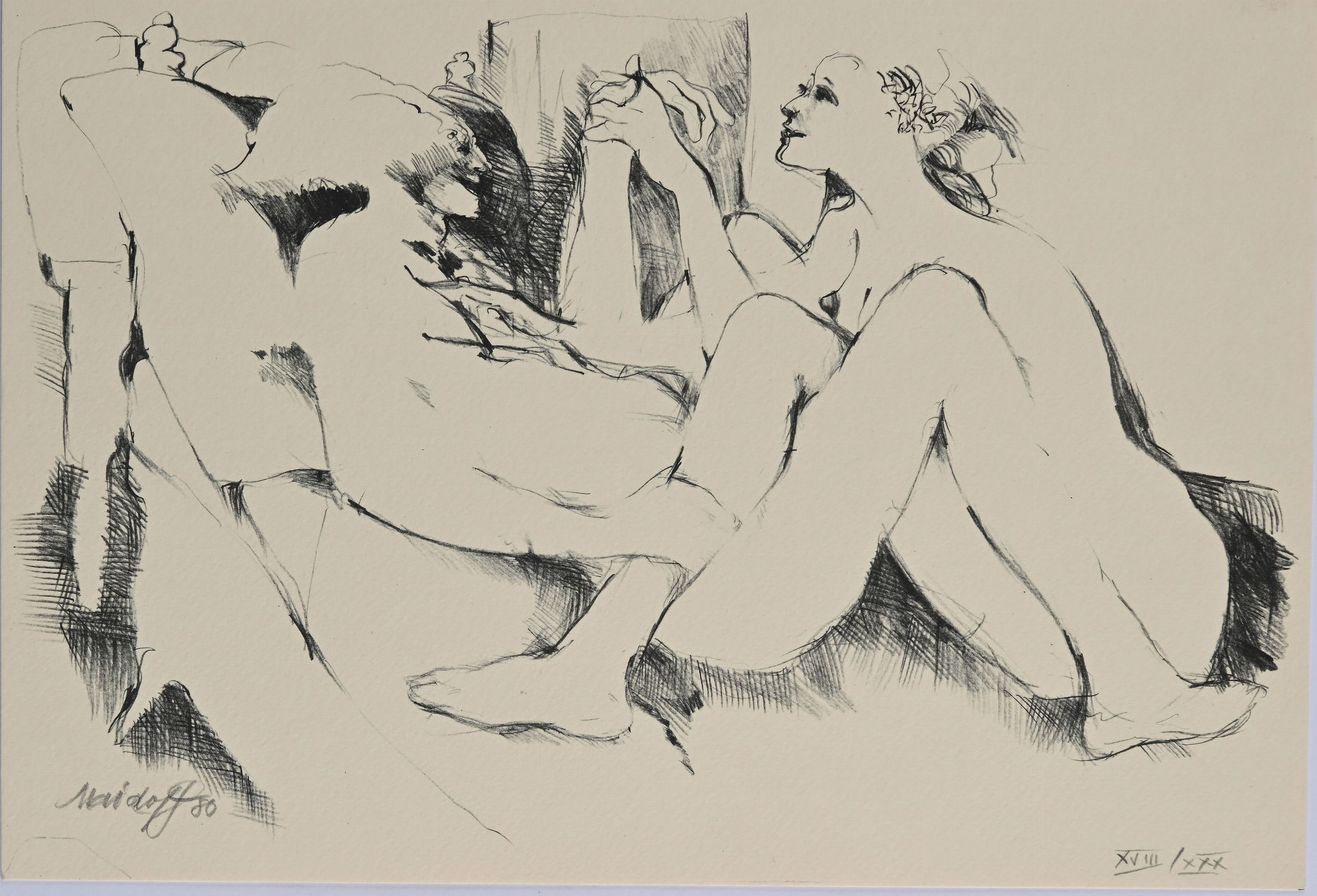 A) Amanti, litografia, 1980. Firma e numerazione Maidoff '80 XVIII/XXX - cm 22x32