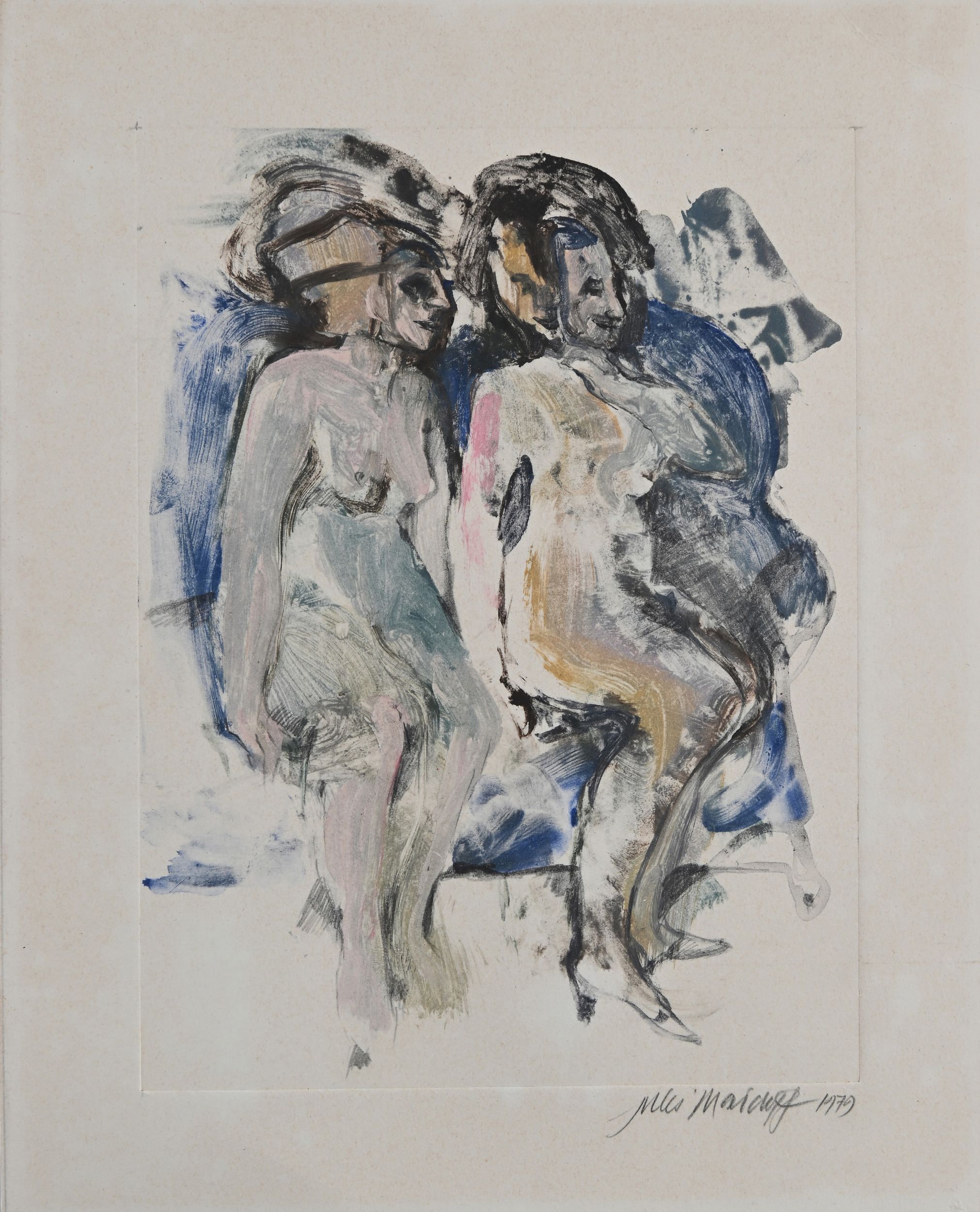 C) Figure sedute, 1979, acquatinta con interventi a carboncino, cm 30,5x24,5. Firma e data Maidoff 1979.