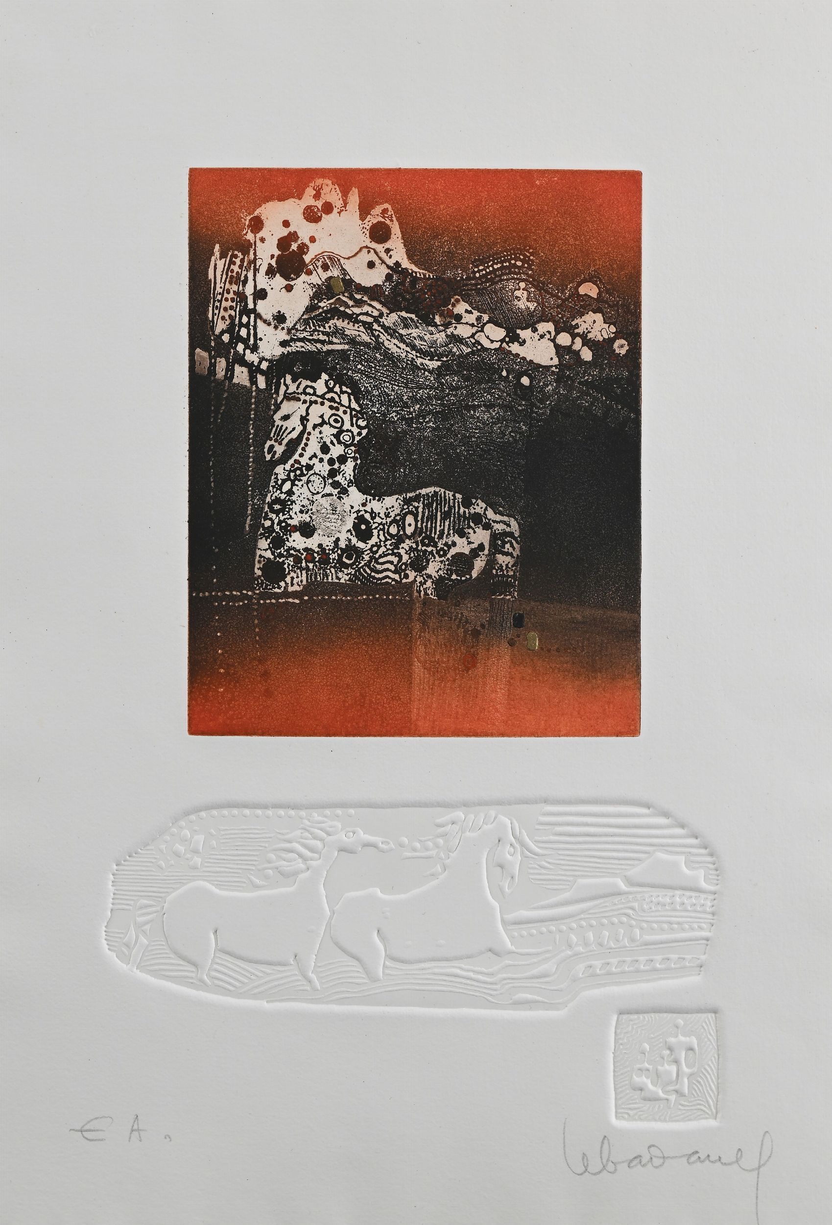 e) Senza titolo, acquaforte, cm 35x25. Firma e numerazione Lebadang E.a.