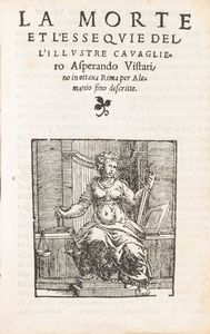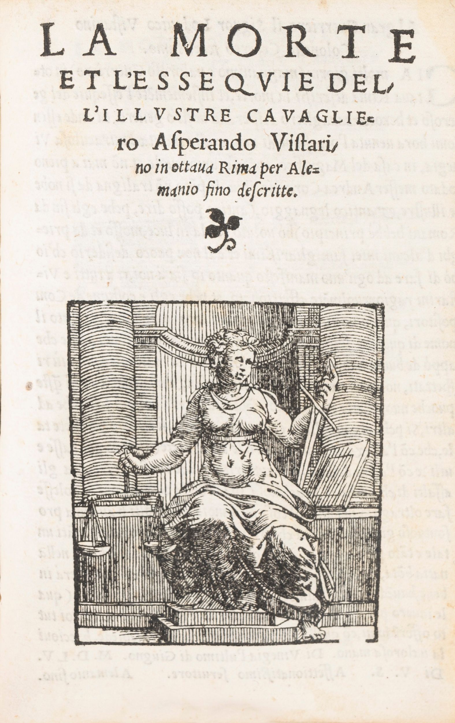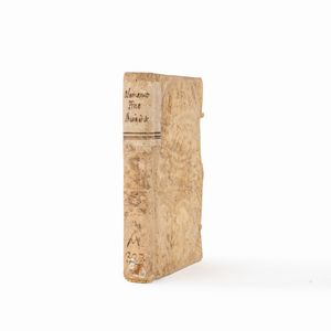 1581 Brixiae, apud Vincentium Sabbium, 1581. In 8°. 32 pp. Stemma al frontespizio. Legato con. Capitoli alla Bernesca di M.Alemanio Fino, scritti a diversi. 40 cc. segnate A-E8, all'ultima carta si legge 'Mancano intorno a cinquanta altri capitoli, i quali per hora non si sono potuti havere. Ma spero stamparli in breve con altre rime dell'istesso autore.' Legato con. Parte seconda de capitoli alla domestica, di m. Alemanio Fino. Raccolti, et posti in luce da Numa Pompilio Fino. Pavia, appresso Girolamo Bartoli, 1579. 36 cc. Marca tipografica al frontespizio. Legato con. La morte et l'essequie dell'illustre cauagliero Asperando Vistarino in ottaua rima per Alemanio Fino descritte . [Venezia, Agostino Bindoni, 1555?]. Marca tipografica al frontespizio. 16 cc. Legato con. Rime di diversi in lode della Carita . Bergamo, s.d.t. 8 cc. [apparentemente scompleto]. Legatura in pergamena floscia coeva con titolo su tassello cartaceo al dorso, sciupata.
