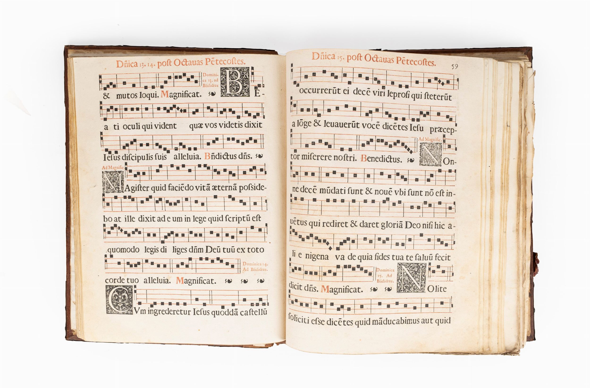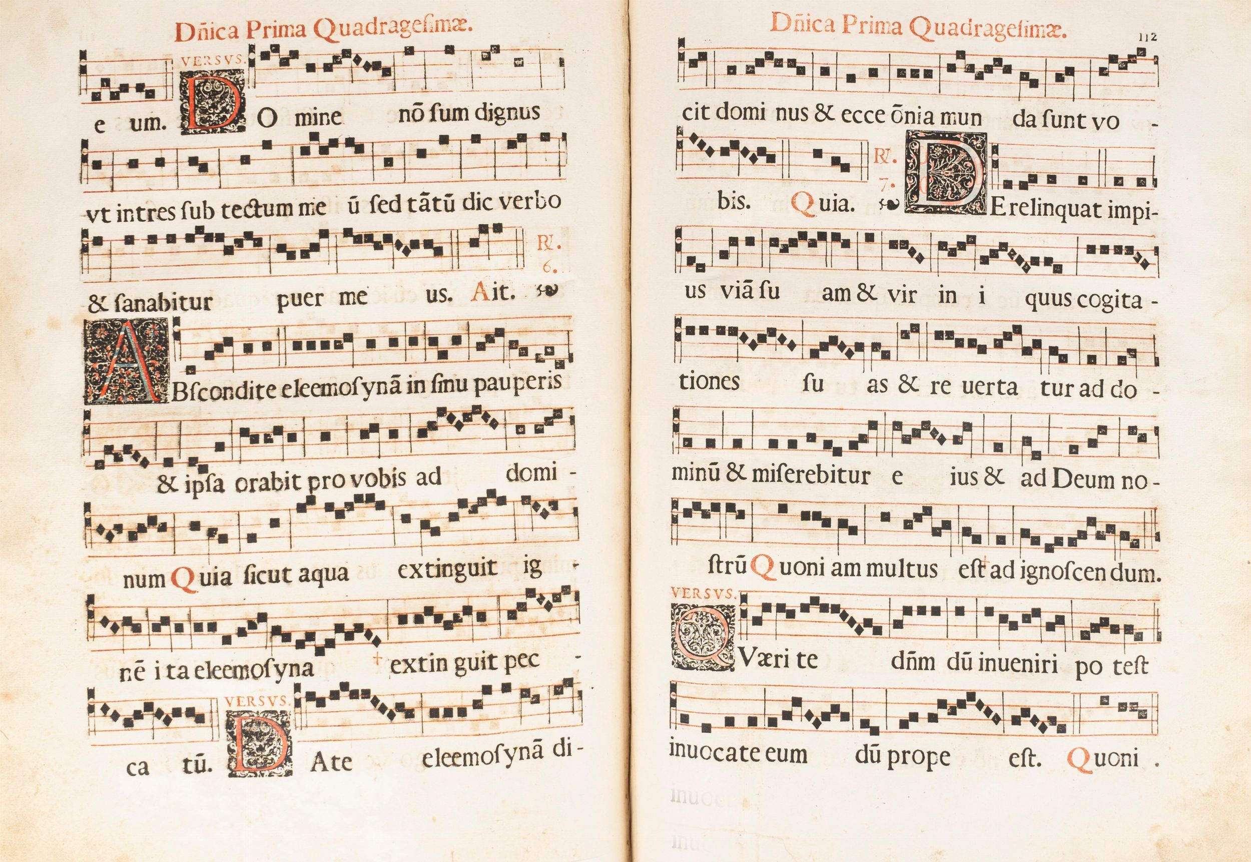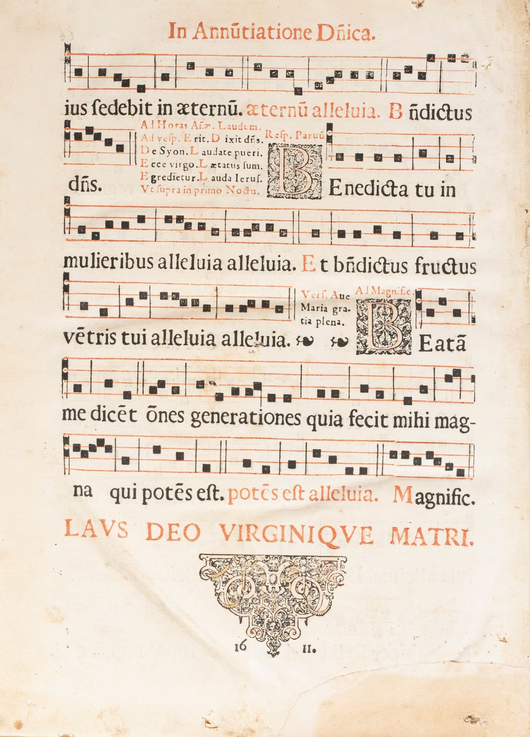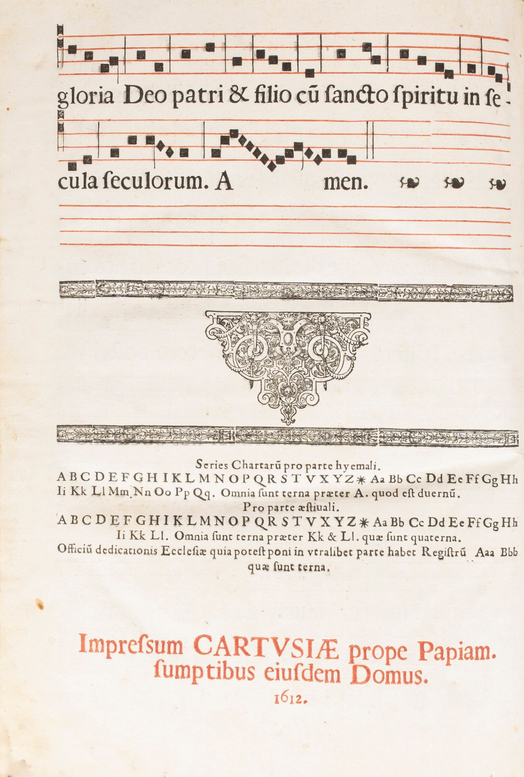 1612 Cartusiae prope Papiam, sumptibus eiusdem Domus, 1612 [Certosa di Pavia, 1612]. In 2°, 525 x 380 mm. 2 parti: Pars Aestiva - Pars Hyemalis, frontespizio della parte Estica colorata all'epoca, aggiunto foglio manoscritto a integrazione a p.63, rinforzi al margine della I carta, aloni di umidità restauri ai margini inferiore e agli angoli inferiori di alcune carte; II parte Invernale, [2], 172, 66 [2], aloni e marginali restauri su alcune carte. In entrambi i volumi capilettera decorati e finemente colorati in rosso e blu, testo in rosso e nero, notazioni musicali in rosso e nero, SPLENDIDE LEGATURE COEVE IN ASSI DI LEGNO , ricoperte di pelle con fermagli, cantonali e borchie, rovinate.
