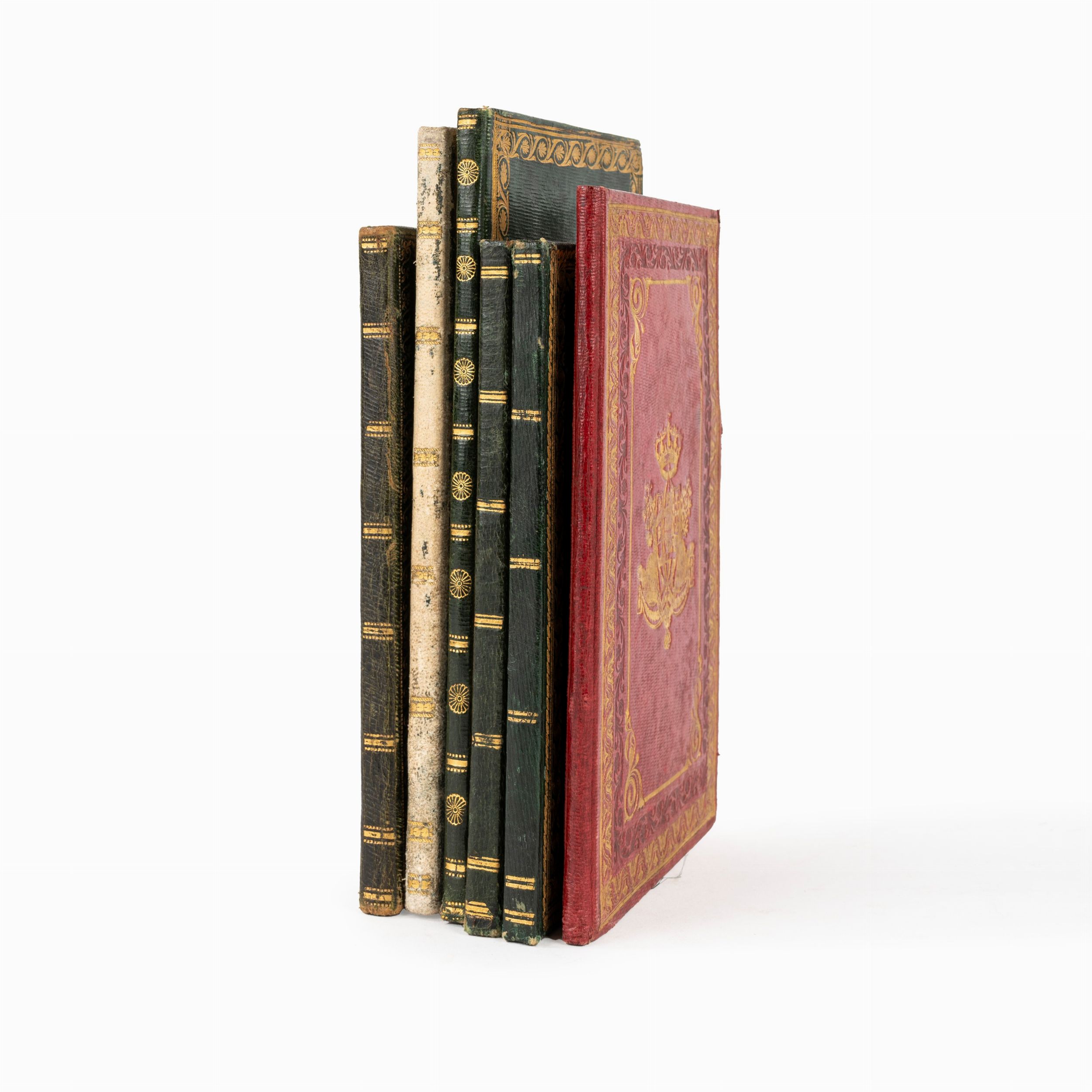 1842 Torino, Fratelli Favale, [1842]. In 8°. Arrossature, splendida legatura in marocchino a grana lunga con decorazioni in oro ai piatti, dove campeggia lo Stemma dei Savoia . Insieme nel lotto altre 5 opere teatrali tutte rappresentate nel Teatro Regio di Torino o nel Carignano, nelle oro eleganti legature in marocchino verde con impresso lo stemma dei Savoia, nella fattispecie quello di Carlo Emanuele III: La Sposa fedele , 1820; La rosa bianca e la rosa rossa , 1819 [libretto impresso su carta azzurra]; Rodrigo di Valenza , 1820; Lo sposo di Provincia , 1823; Gianni di Parigi , 1823.
