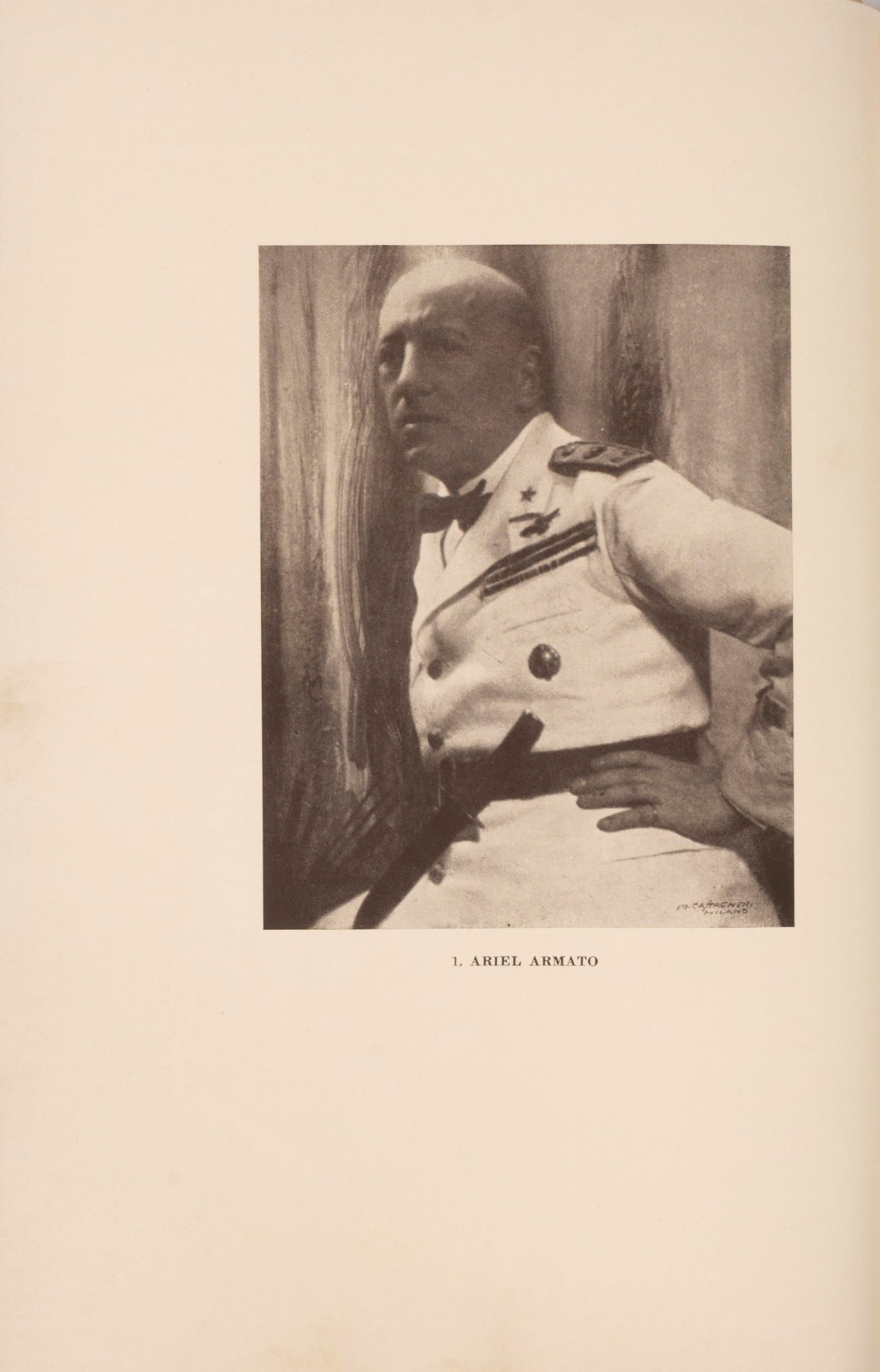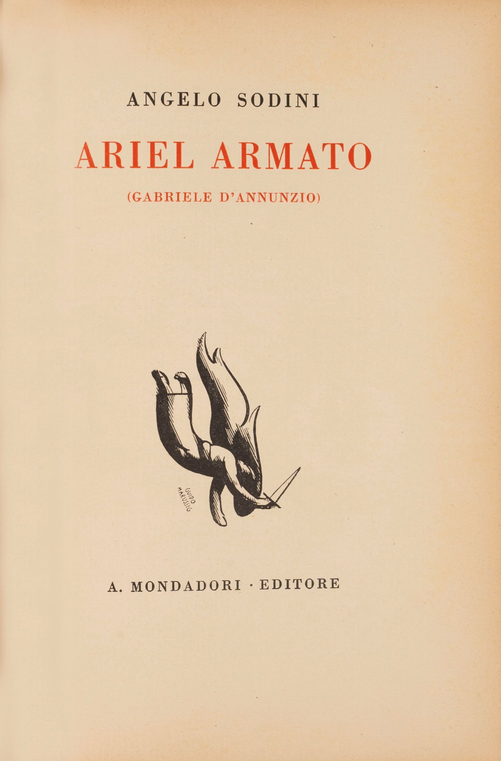1931 A. Mondadori, 1931. Due volumi in 8° grande. Legatura in mezza pergamena con angoli firmata Riviere & Son, dorso riccamente impresso in oro con elaborati motivi floreali, tagli dorati. Frontespizio stampato in caratteri rossi e neri, ritratto del Vate protetto da velina, numerose illustrazioni nel testo ed a piena pagina, ex libris Enzo Lopez. Lievi segni del tempo.