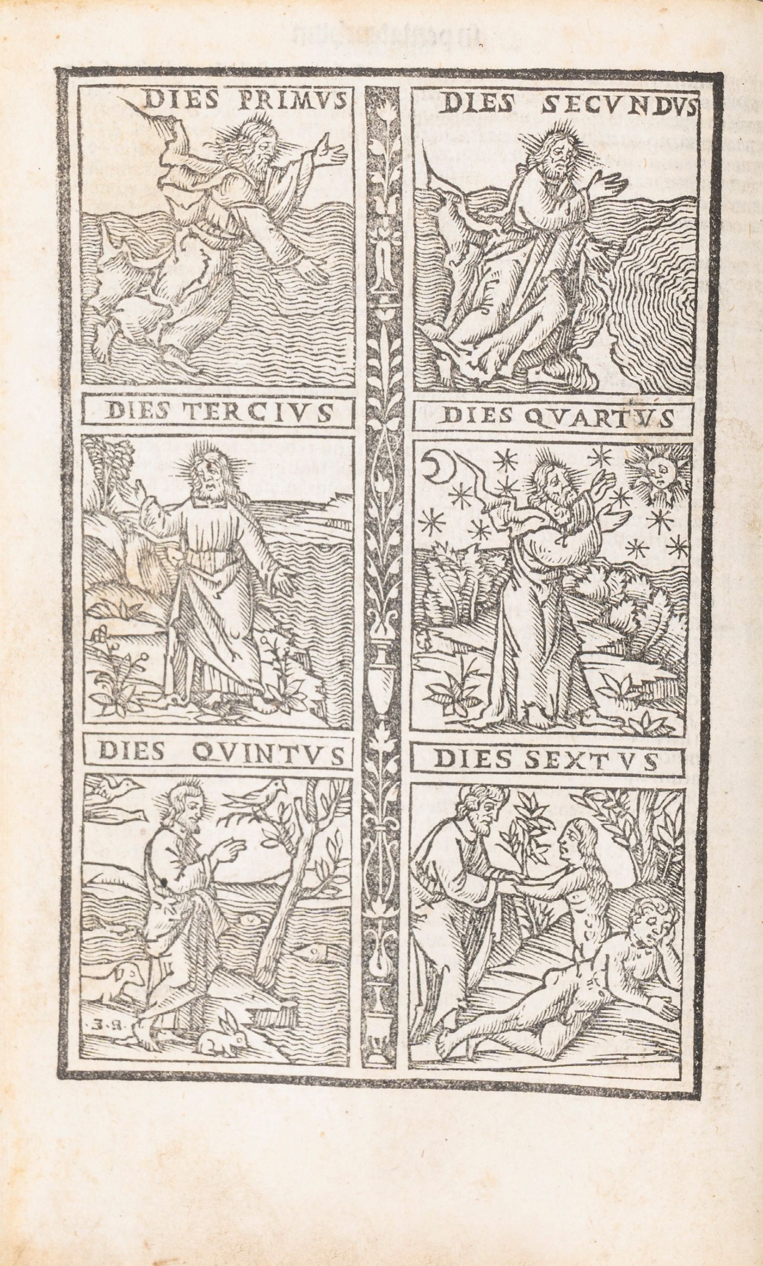 1519 [Venezia : Lucantonio Giunta il vecchio], 15 ottobre 1519. In 8°. Frontespizio in rosso nero, con bordura, vignetta e marca tipografica incise in legno, 2 tavole a piena pagina, diverse illustrazioni xilografiche nel testo, restauro al margine superiore del frontespizio, errori di impaginazione (le 4 cc. successive al frontespizio sono usualmente dopo 3✝¹⁰; le successive cc 1-7⁸ vanno usualmente in fine al volume), mancanti le cc 57 e 64, legatura coeva in pergamena rigida, tasselli con titoli al dorso, lievi difetti. Ex libris cartaceo al contropiatto.