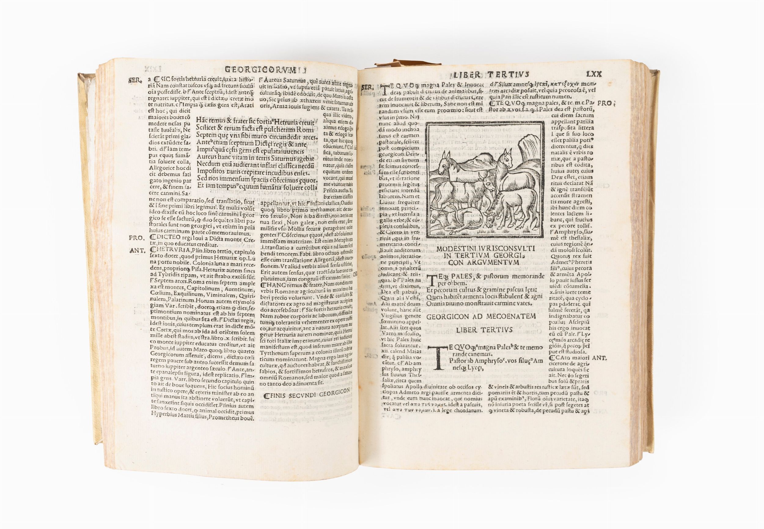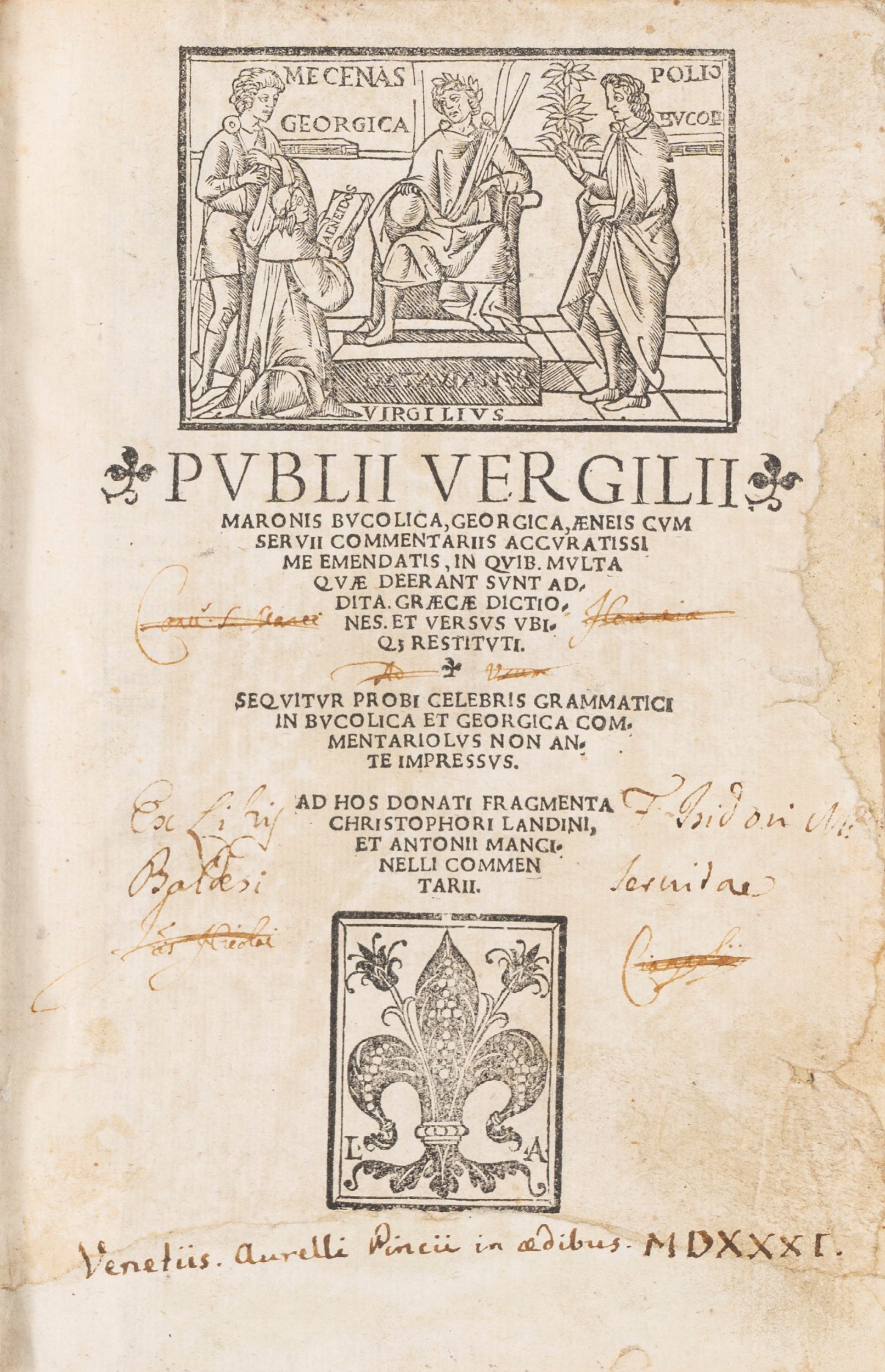 1531 Venezia, Lucantonio Giunta, [1531]. In 4°. Al frontespizio incisione xilografica di Virgilio che presenta l'Eneide ad Augusto, marca tipografica al frontespizio e in fine, illustrazioni xilografiche, frontespizio restaurato, restauro al margine esterno cc. II-XLIII, lieve difetto al margine esterno di alcune carte, rare arrossature, piccola macchia di inchiostro a censurare le nudità della vignetta al verso della c. CCLV dell'Eneide, legatura coeva in piena pergamena rigida, titolo in oro entro tassello al dorso. Note di appartenenza al frontespizio.