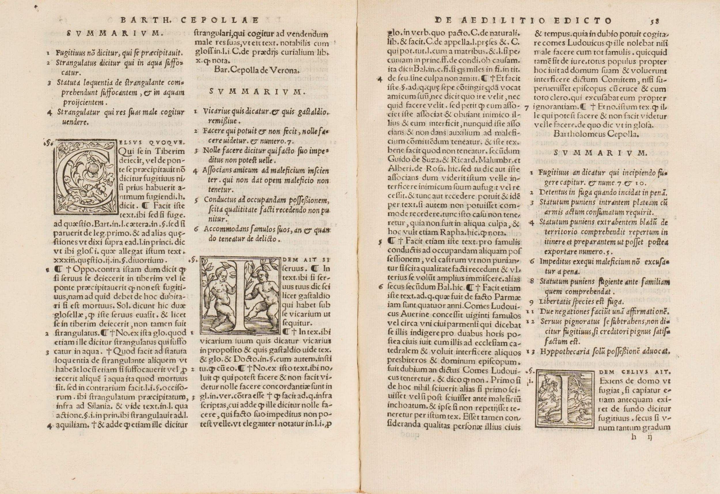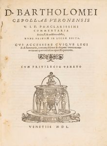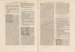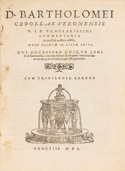 1550 Venezia, [al segno della fontana], 1550. In 4°. Marca tipografica al frontespizio, iniziali incise, testo su due colonne, rare fioriture, carta di guardia parzialmente staccata, legatura coeva in pergamena, titolo manoscritto al dorso e al taglio inferiore e superiore, tracce di lacci, lievi difetti, legatura staccata dal corpo del libro