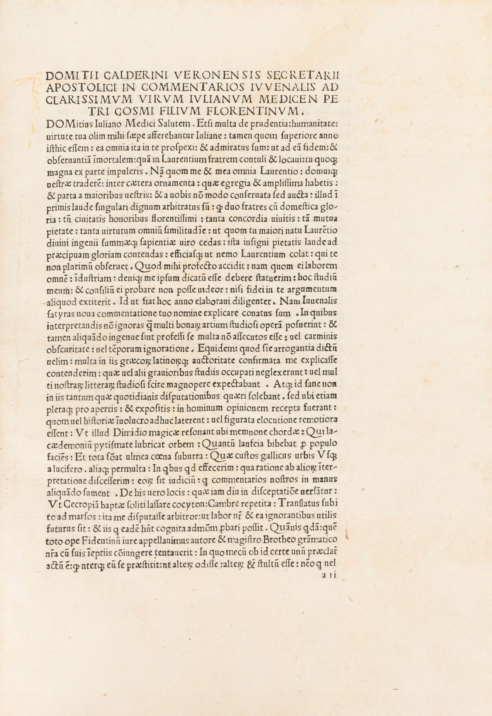 1476 [Venezia, stampatore del Domitius Calderinus, 1476-77]. In 2°. 285 x 200mm., testo su una colonna in carattere romano, spazi per capilettera, manca la carta I8 e il fascicolo K finale di 6 carte, per un totale di 7 carte in fine (supplite in facsimile), esemplare altrimenti perfetto, legatura in mezza pelle marrone e cartonato, nota di possesso coevo al primo foglio e moderne annotazioni bibliografiche.