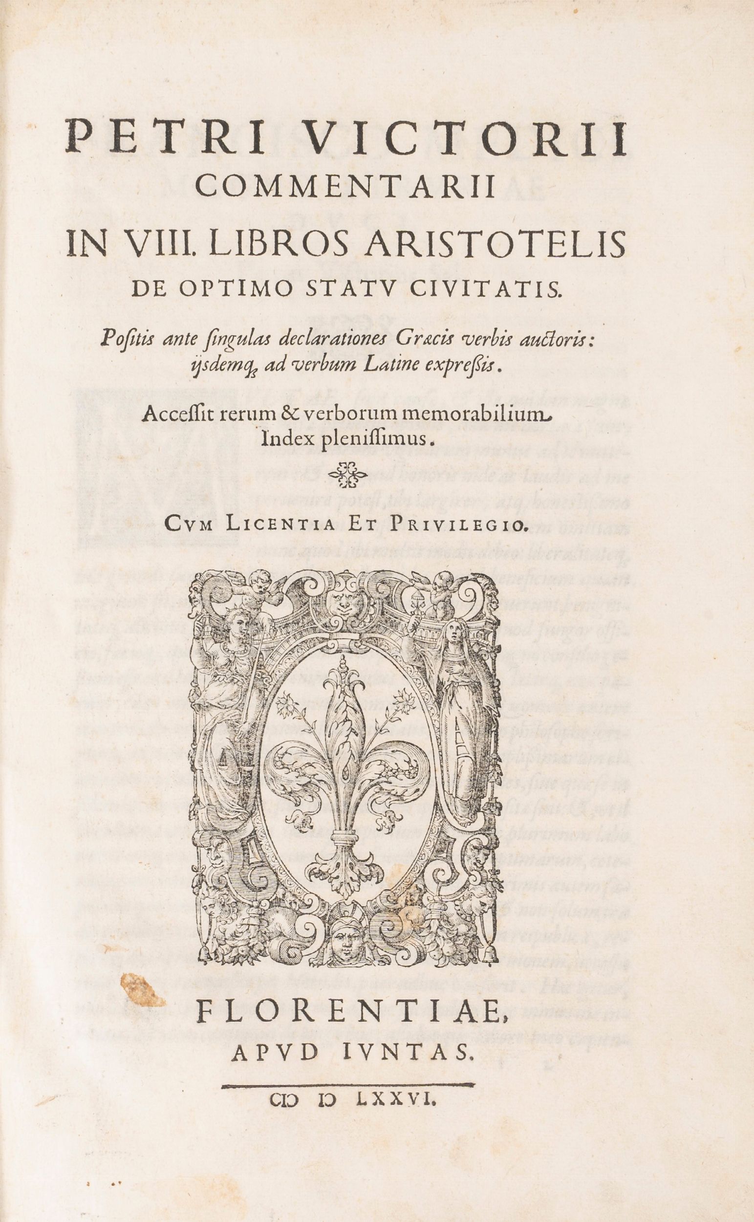 1576 Firenze, eredi di Giunta, 1576. In 2°. Marca tipografica al frontespizio e in fine, iniziali xilografiche, qualche lieve difetto, legatura coeva in pergamena rigida, tassello con titolo in oro al dorso, lievi difetti. Tassello cartaceo di appartenenza al contropiatto. § Insieme nel lotto dello stesso autore e con stessa legatura: Commentarii in tres libros Aristotelis de arte dicendi , Firenze, Giunta, 1589. In 2°. Marca tipografica al frontespizio e in fine, iniziali xilografiche, alcune figure geometriche nel testo, lievi fioriture, alcune arrossature, legatura coeva in pergamena rigida, tassello con titolo in oro al dorso, alcuni fori di tarlo, lievi difetti. Firma di appartenenza cancellata al frontespizio. § Commentarii in primum librum aristotelis de arte poetarum , Firenze, eredi Bernardo Giunta, 1560. In 2°. Marca tipografica al frontespizio e in fine, iniziali xilografiche, qualche lieve fioritura, legatura coeva in pergamena rigida, tassello con titolo in oro al dorso, lievi difetti.