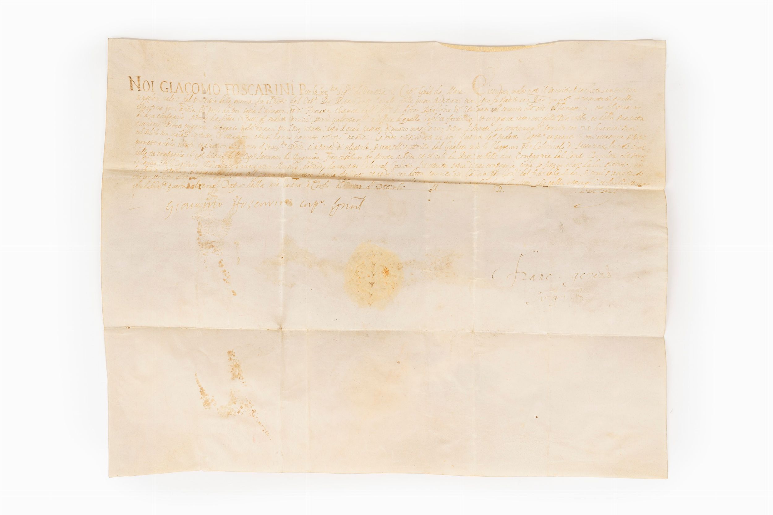 1572 Bella pergamena di 290 x 375 mm. che contiene la concessione a Pietro Conte della nomina di Colonnello per meriti militari guadagnati nelle spedizioni a Cipro, Candia etc. La concessione arriva dal Doge Giacomo Foscarini ed è sottoscritta da Giovanni Foscarini presso la galera sita a Corfù, 1 dicembre 1572. Un anno dopo la battaglia di Lepanto!