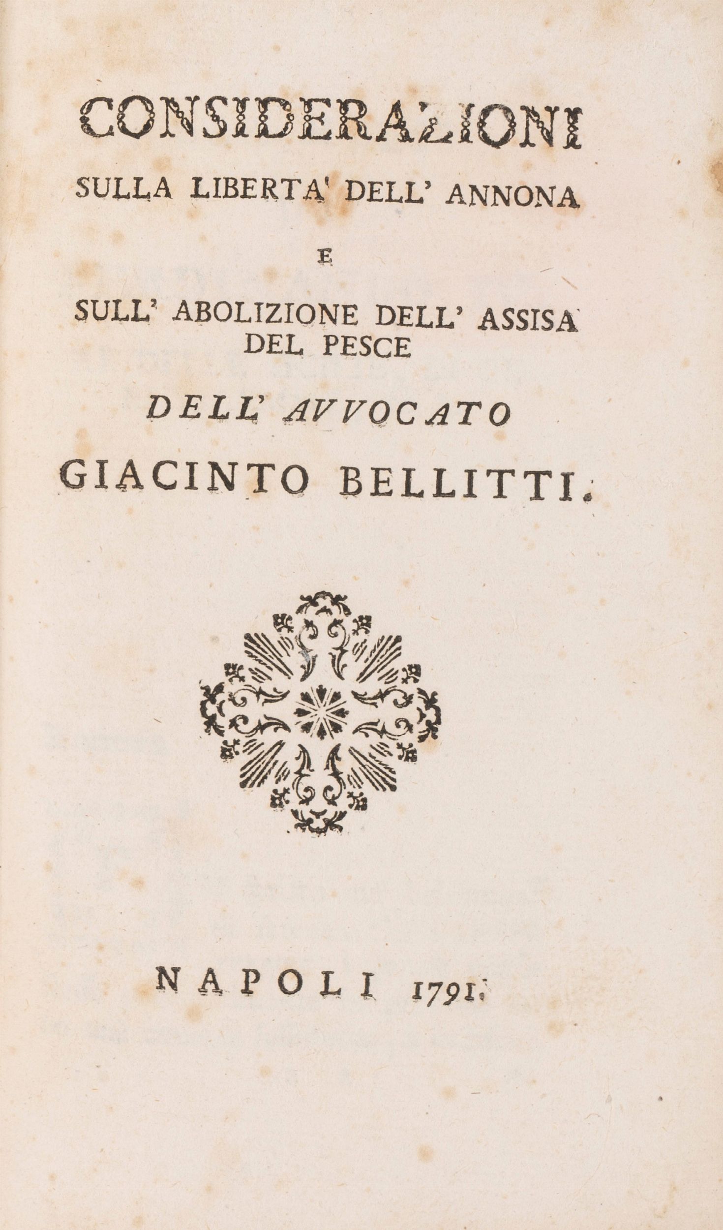 1791 Napoli, 1791. 8°, pp. VIII-77. Legatura in piena pergamena, titolo calligrafico. Alone d'umidità alle prime carte, leggera brunitura, lievi fioriture. Estremamente raro.