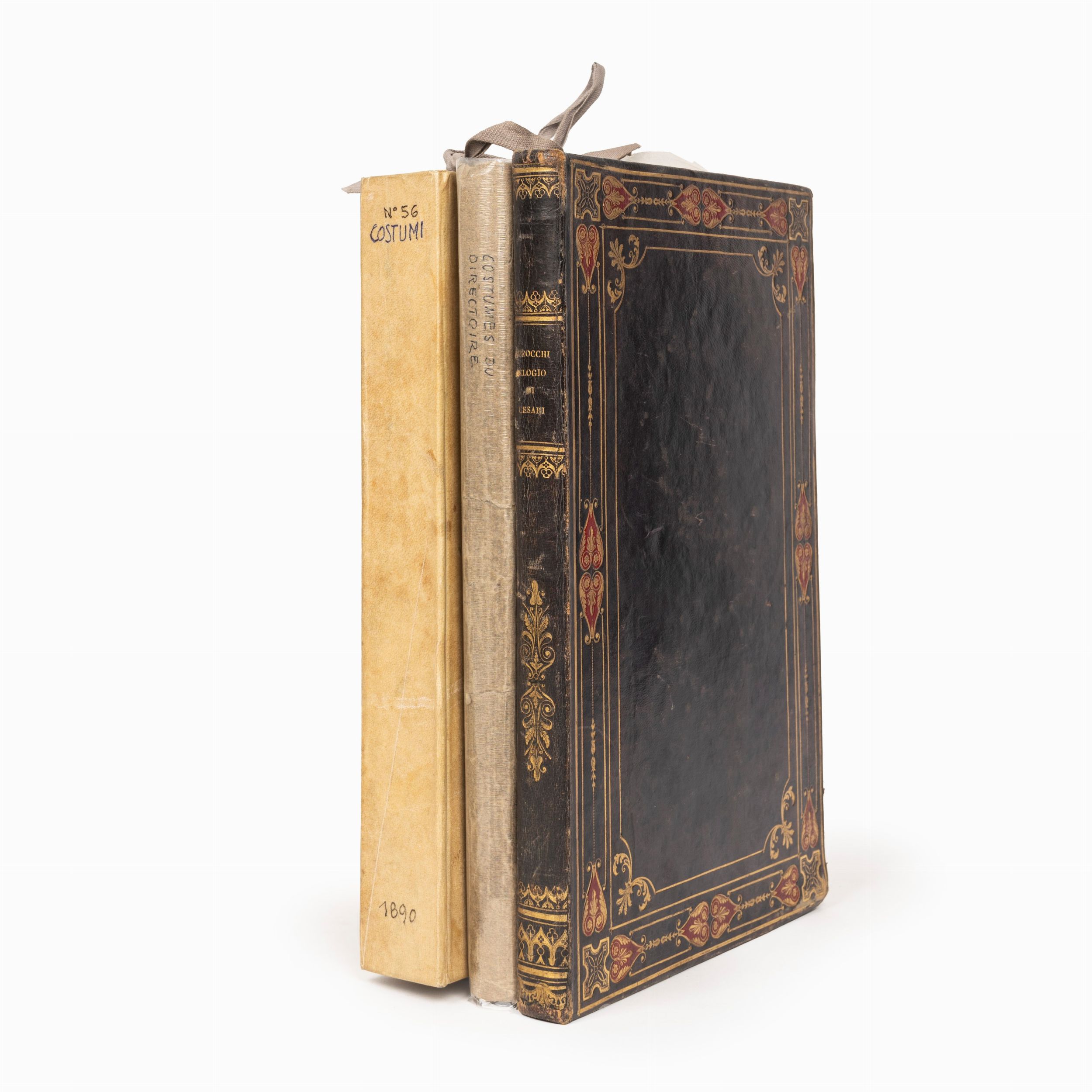 1875 Parigi, Rouquette, 1875. Frontespizio in rosso e nero, 12 pagine di testo esplicativo, ritratto calcografico dell'autore e 30 tavole sciolte ad acquaforte (37 x 27 cm) di A. Guillaumot. Entro cartoncino azzurro. § Insieme: Raccolta di 29 illustrazioni (26,2x17,2 cm) colorate a mano di moda femminile e maschile, tratte da 'Il Corriere delle dame', 'Magasin des demoiselles', e 'Le favori des dames', 1847. Legatura in pelle con cornice e fregi impressi in oro ai piatti, titolo e fregi in oro al dorso liscio, qualche graffio. § Raccolta di incisioni sciolte di costumi tradizionali da tutto il mondo colorate a mano, 24,3 x 17 cm, 1890. Entro cartella in mezza pergamena con bindelle in stoffa.