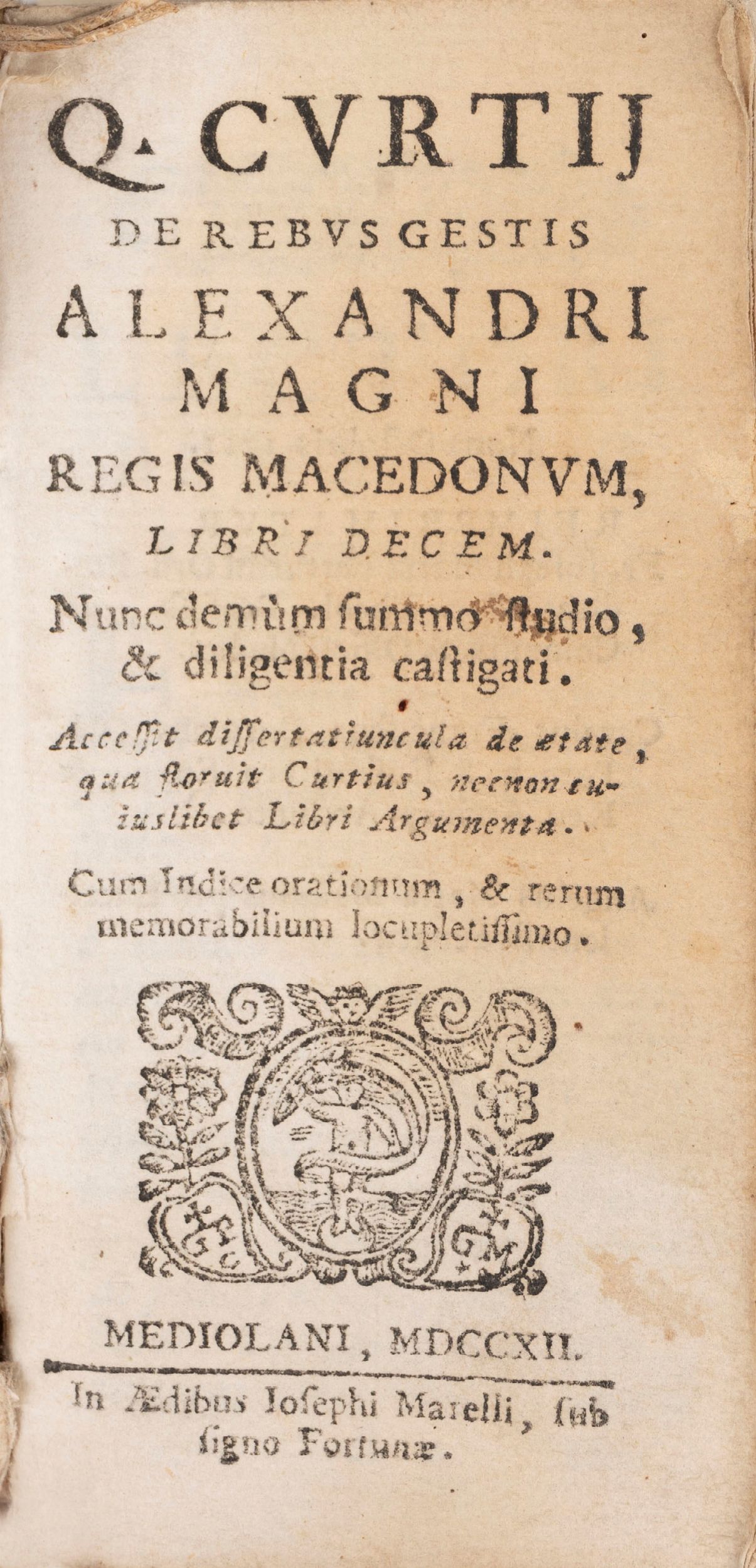 1712 Milano, Giuseppe Marelli, 1712. In 24°. Marca tipografica al frontespizio, rare arrossature, legatura coeva in pergamena, parzialmente staccata da corpo del libro, lievi difetti. Firma di appartenenza cancellata al contropiatto.