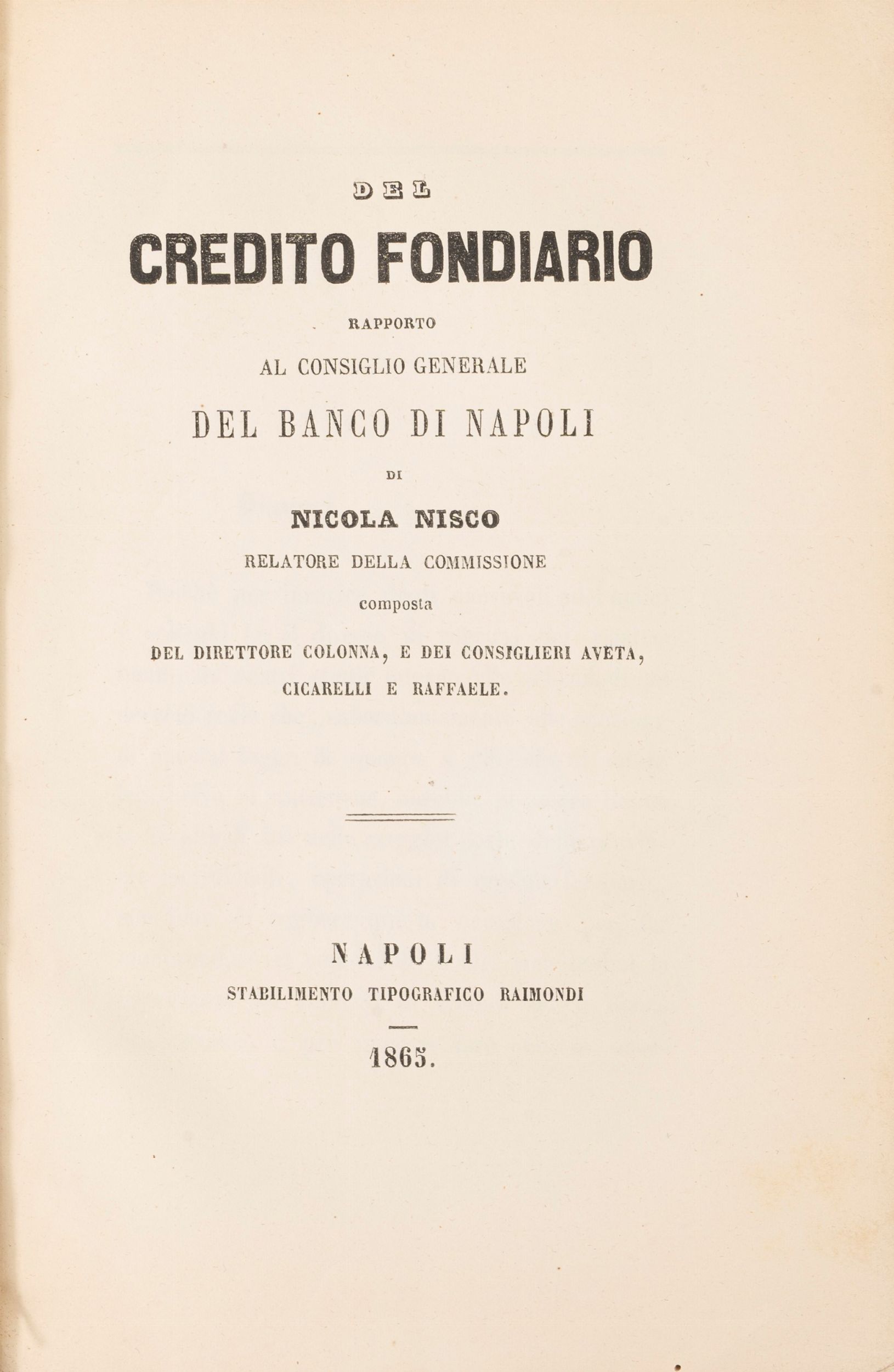 1865 Napoli, Raimondi, 1865. In 8°. (Progetto di Decreto Reale per l'esercizio del Credito Fondiario nelle Province Napoletane). Legatura in mezza pelle, titolo in oro al dorso. Conservate le copertine originali, qualche macchia.