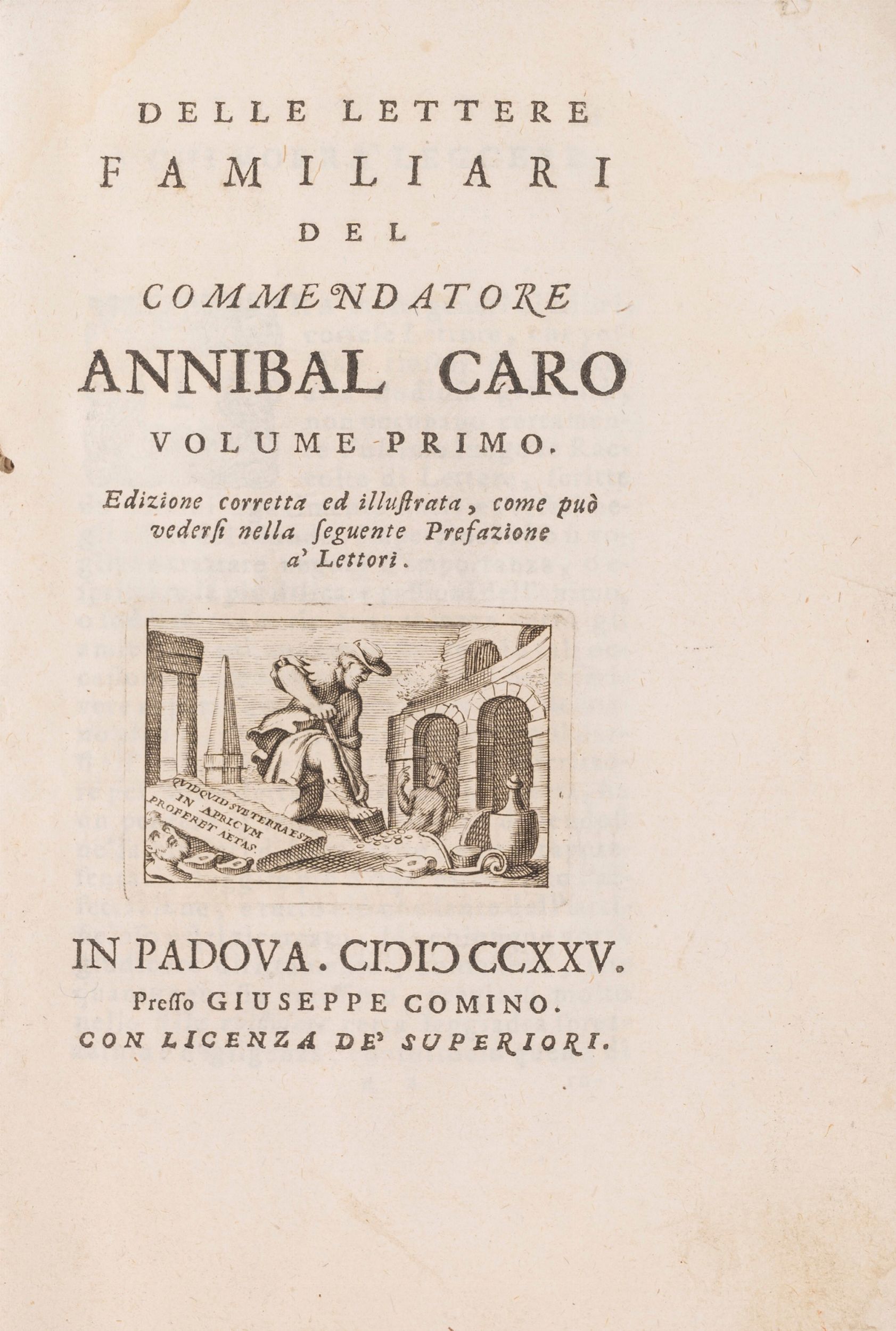1725 In Padova, presso Giuseppe Comino, 1725. In 8° piccolo. Legatura coeva in cartone alla rustica. Esemplare in barbe. Due tomi rilegati in un volume. Marca tipografica in fine. Angolo superiore della cucitura con gora d'acqua che si espande per metà del volume. Sporadiche tracce di tarlo.
