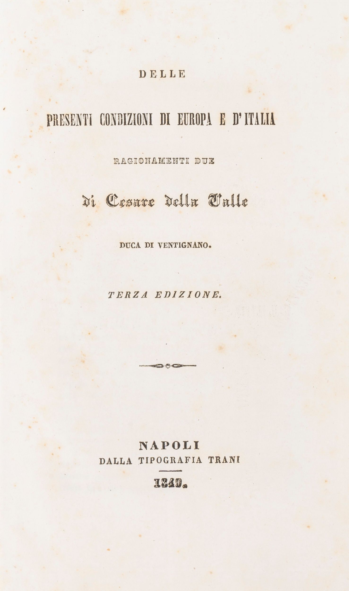 1849 Napoli, Trani, 1849. In 8°. Legatura, realizzata nella Bottega dei Trani, in tela setificata con cornici e grande fleuron al centro dei piatti, incisi a secco. Edizione a tiratura limitata. Lievi fioriture.