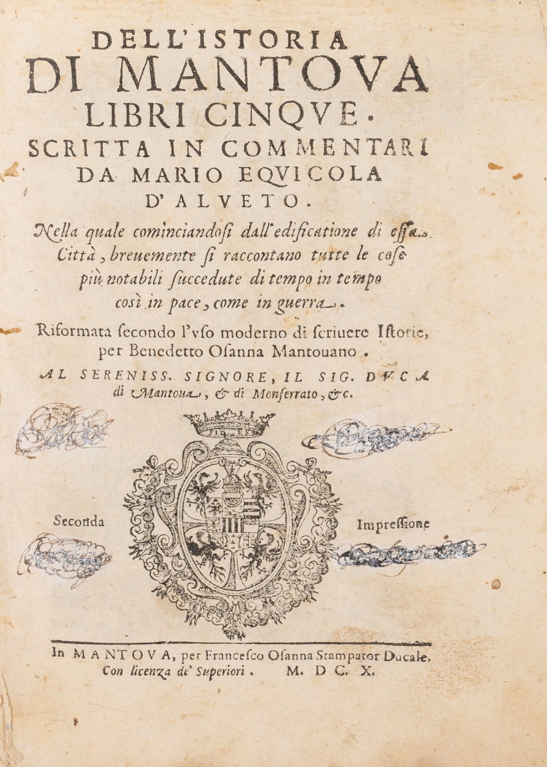 1610 Mantova, Francesco Osanna, 1610. In 4°. Stemma al frontespizio, iniziali e fregi xilografici, leggera brunitura, legatura in piena pergamena con unghie, tagli marmorizzati. Ex libris cartaceo alla carta di guardia, firme di appartenenza cancellate al frontespizio.