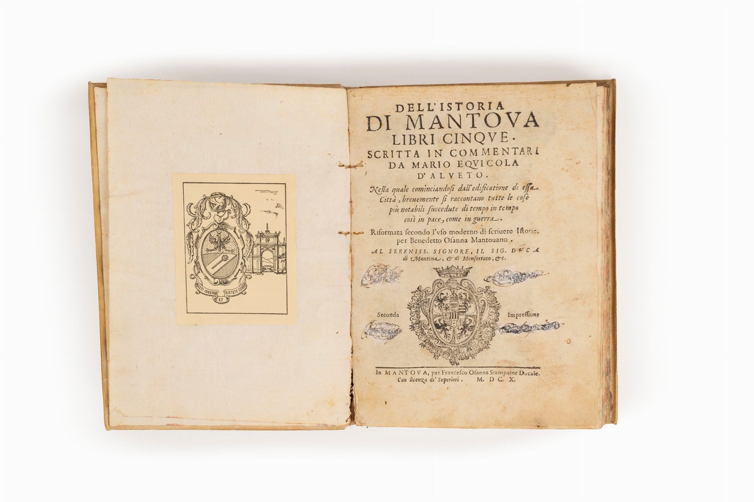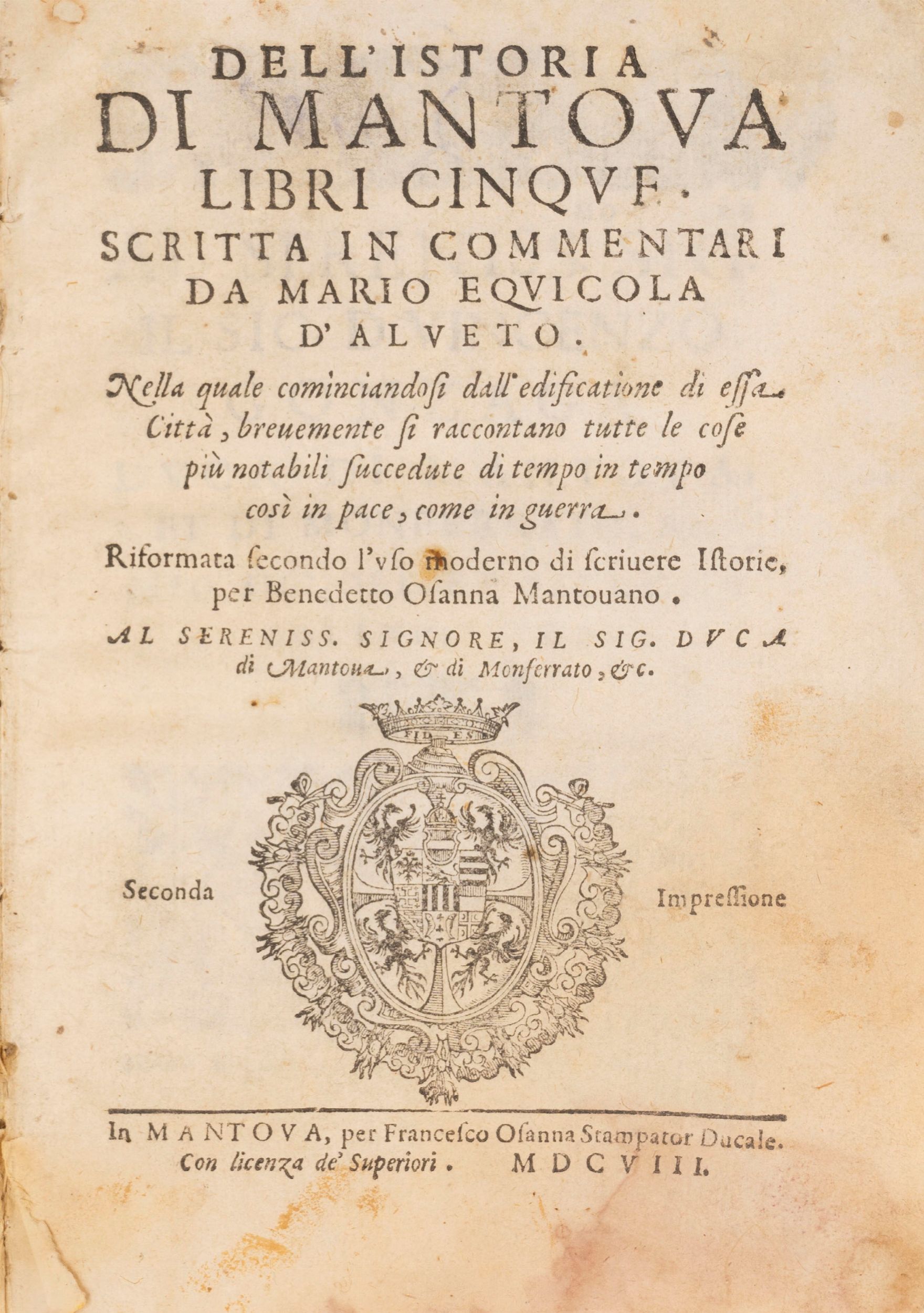 1608 Mantova, Francesco Osanna, 1608. In 4°. Stemma dei Gonzaga al frontespizio, fregi xilografici, lievi difetti, legatura coeva in pergamena. § Insieme nel lotto diversa edizione dello stesso testo: Dell'Istoria di Mantova libri cinque , Mantova, Francesco Osanna, 1610.
