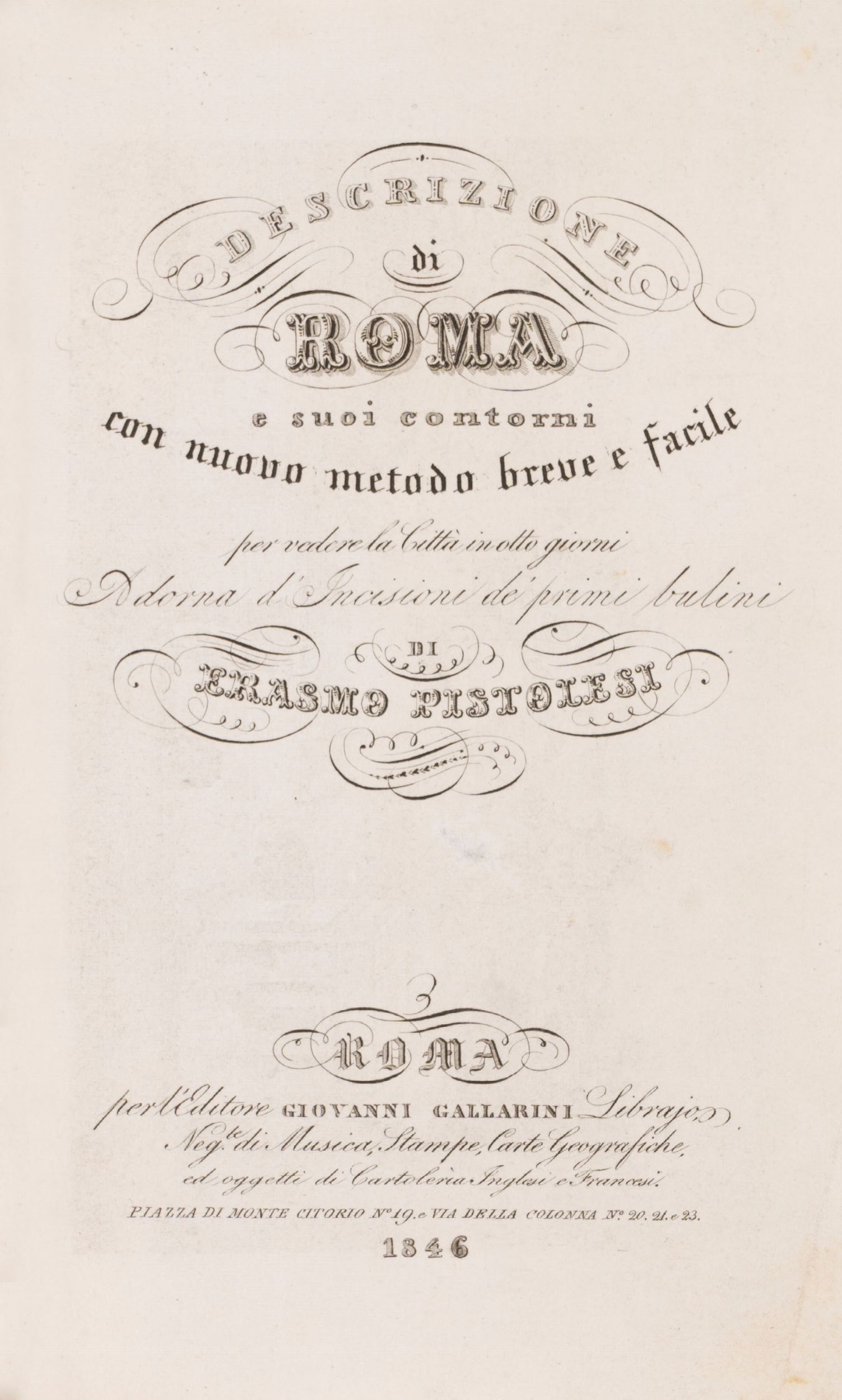 1846 Roma, Giovanni Gallarini, 1844. In 16°. Antiporta incisa in rame che raffigura il Foro Romano, una carta topografica più volte ripiegate e 6 tavole f.t. a piena pagina. Legatura recente in mezzo marocchino con titolo in oro al dorso e custodia.