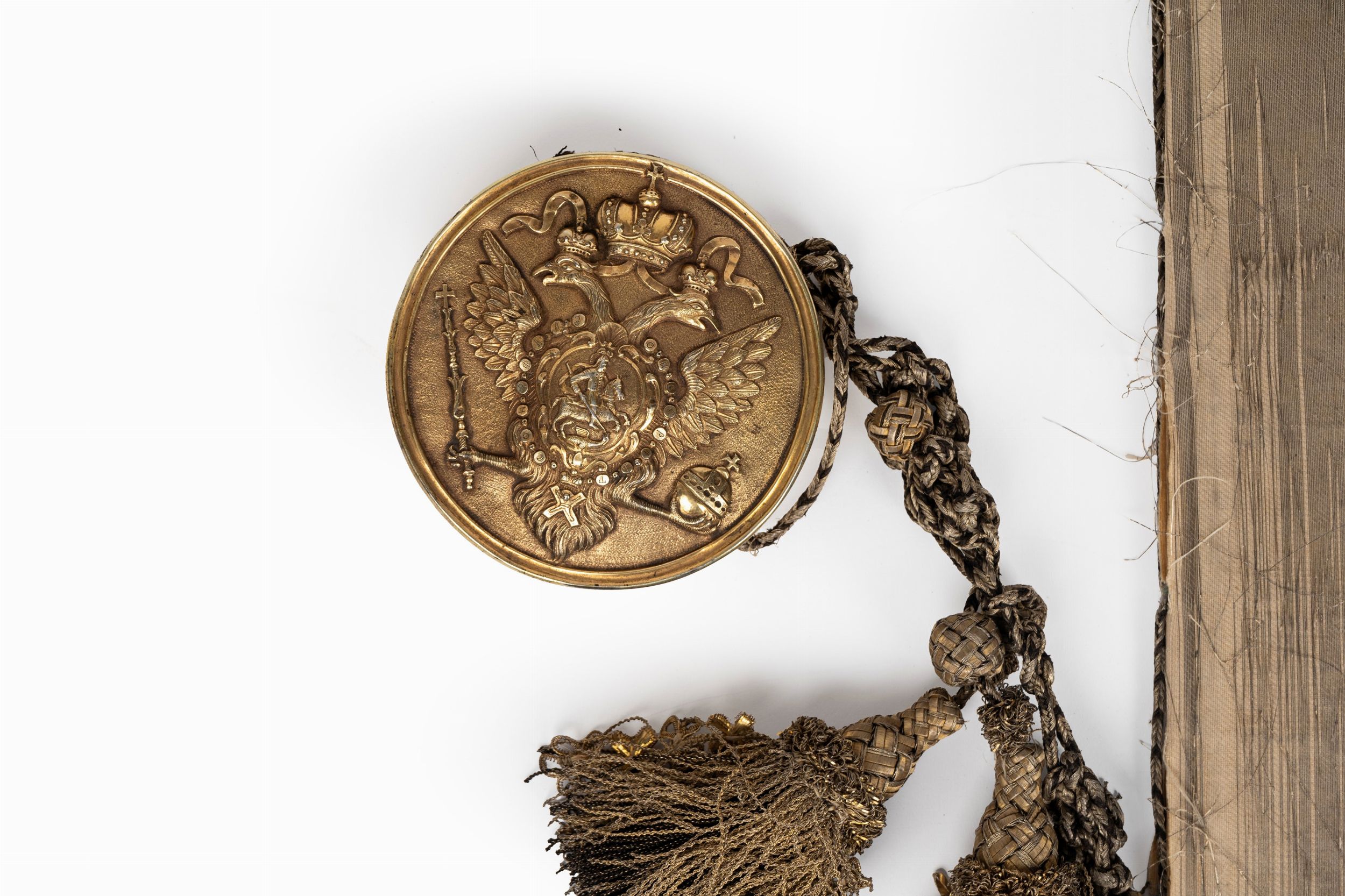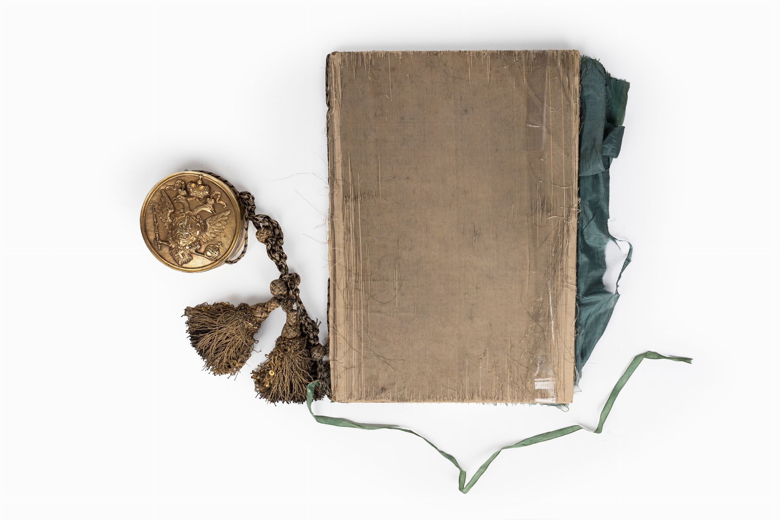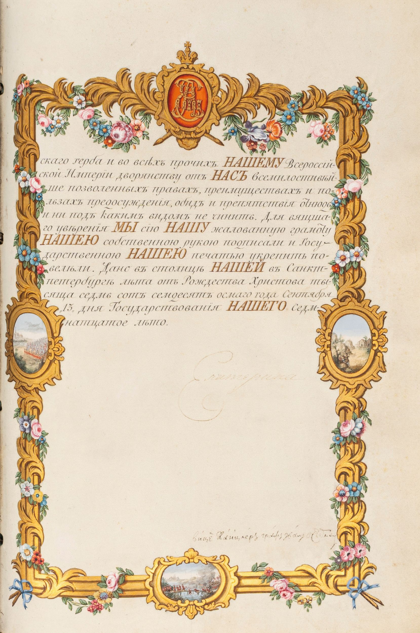 1778 Diploma imperiale di nobiltà ereditaria, conferito alla famiglia Zimmerman e ai suoi discendenti dalla zarina Caterina II, mediante la concessione dello stemma e del sigillo. Documento pergamenaceo composto da 5 fogli per un totale di 10 pagine, 420 x 295 mm. Il testo è inquadrato in cornice fitomorfa, intersecata da cammei: quello in alto al centro reca le iniziali della zarina, EA (Ekaterina Alekseevna), tutti gli altri, invece, immagini di battaglie (si riferiscono probabilmente alle battaglie nelle quali si erano distinti i fratelli Zimmerman, che prestavano servizio nell'esercito russo sotto Caterina II), alla prima carta campeggia il ritratto di Caterina entro ovale che sovrasta San Giorgio e il drago, il tutto sopra l'aquila bicipite nera simbolo della Russia, al recto del quarto foglio lo stemma araldico concesso alla famiglia Zimmerman , firmato all'ultima carta da Caterina II (Ekaterina) e sottoscritto dal vice cancelliere; contiene anche la descrizione dello stemma: uno scudo intagliato in sei parti, tre dorate e tre azzurre, coronato da un elmo con sopra una testa di leopardo dal quale emergono tre piume di struzzo. Fogli di seta verde a proteggere ogni singola pagina, legatura ricoperta da fili di seta, molto rovinata, grande sigillo in ceralacca di 120 mm di diametro perfettamente conservato entro bossolo metallico. Il tutto raccolto in pregevole cofanetto di pelle verde.