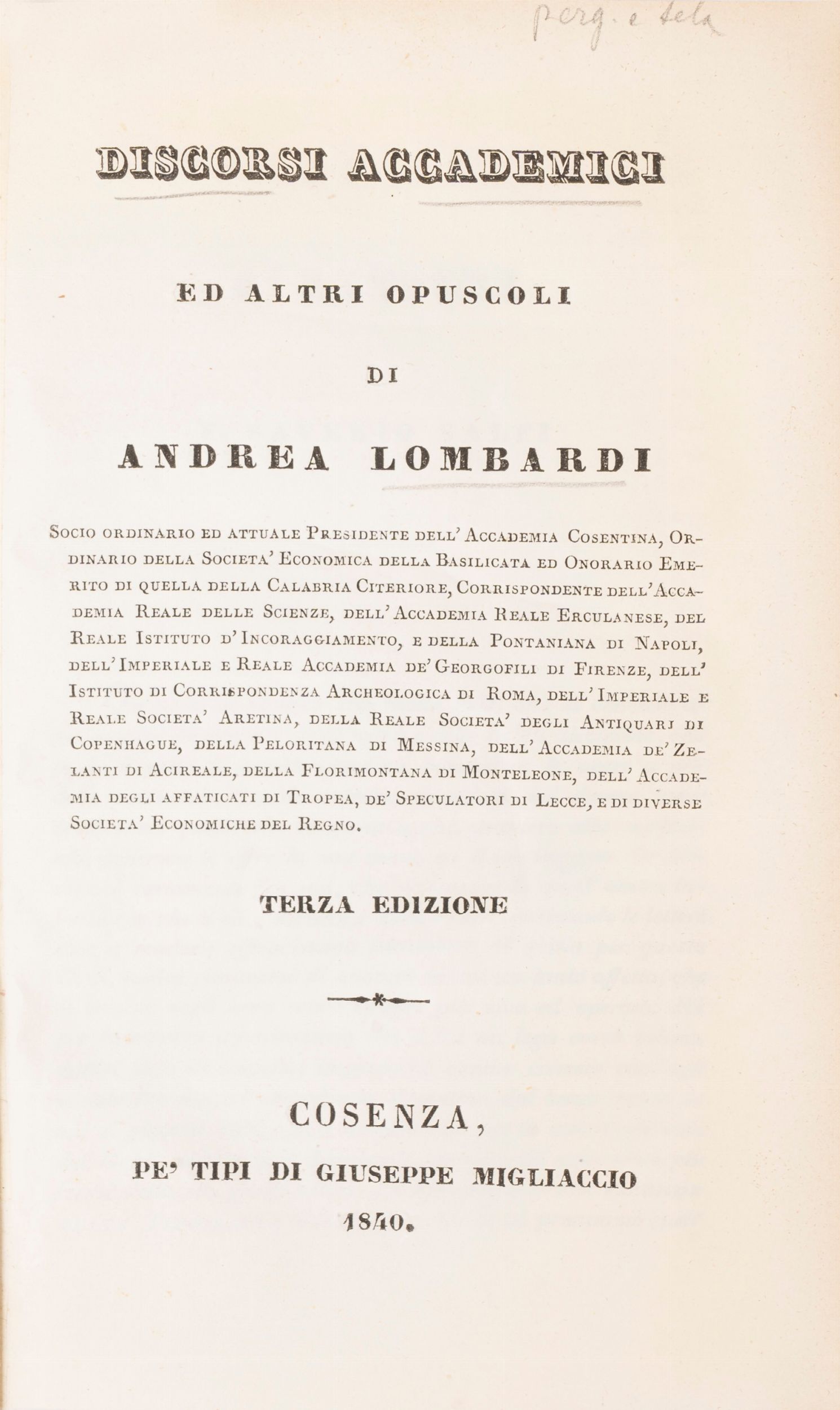 1840 Cosenza, Migliaccio, 1840. In 8°. Legatura in mezza pergamena con angoli, titolo in nero al dorso. Ottimo esemplare.