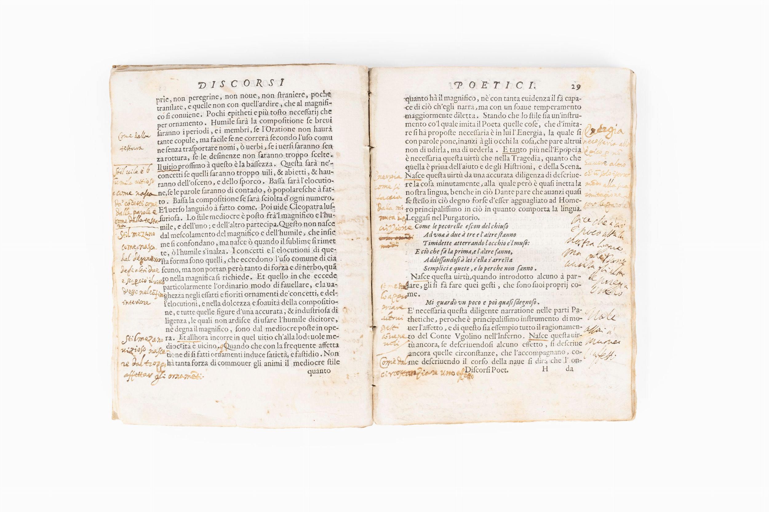 1587 Venezia, [Compagnia degli Uniti] for Giulio Vassalini, 1587. In 4°. Marca dello stampatore al frontespizio, alcune carte lente, pergamena floscia posteriore con titolo al dorso, annotazioni marginali su tutto il testo del letterato Tommaso Stigliani (Matera 1573-Roma 1651) .