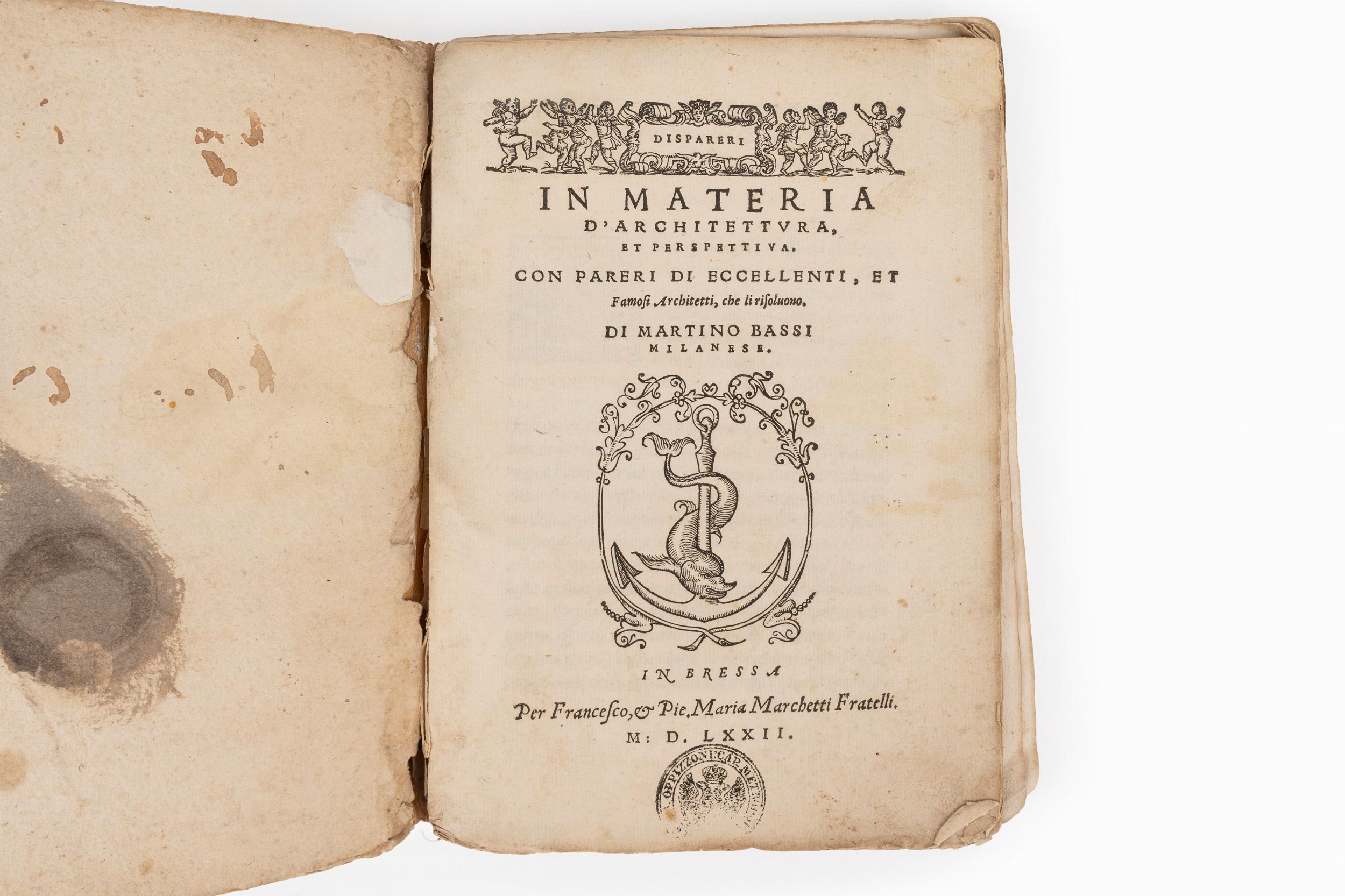 1572 Brescia, Francesco e Pietro Maria Marchetti, 1572. In 4°. 48 cc (su 54), 10 tavole (su 12), bruniture, legatura in cartoncino dell'epoca con disegno di un leone rampante. Timbro nobiliare al frontespizio.