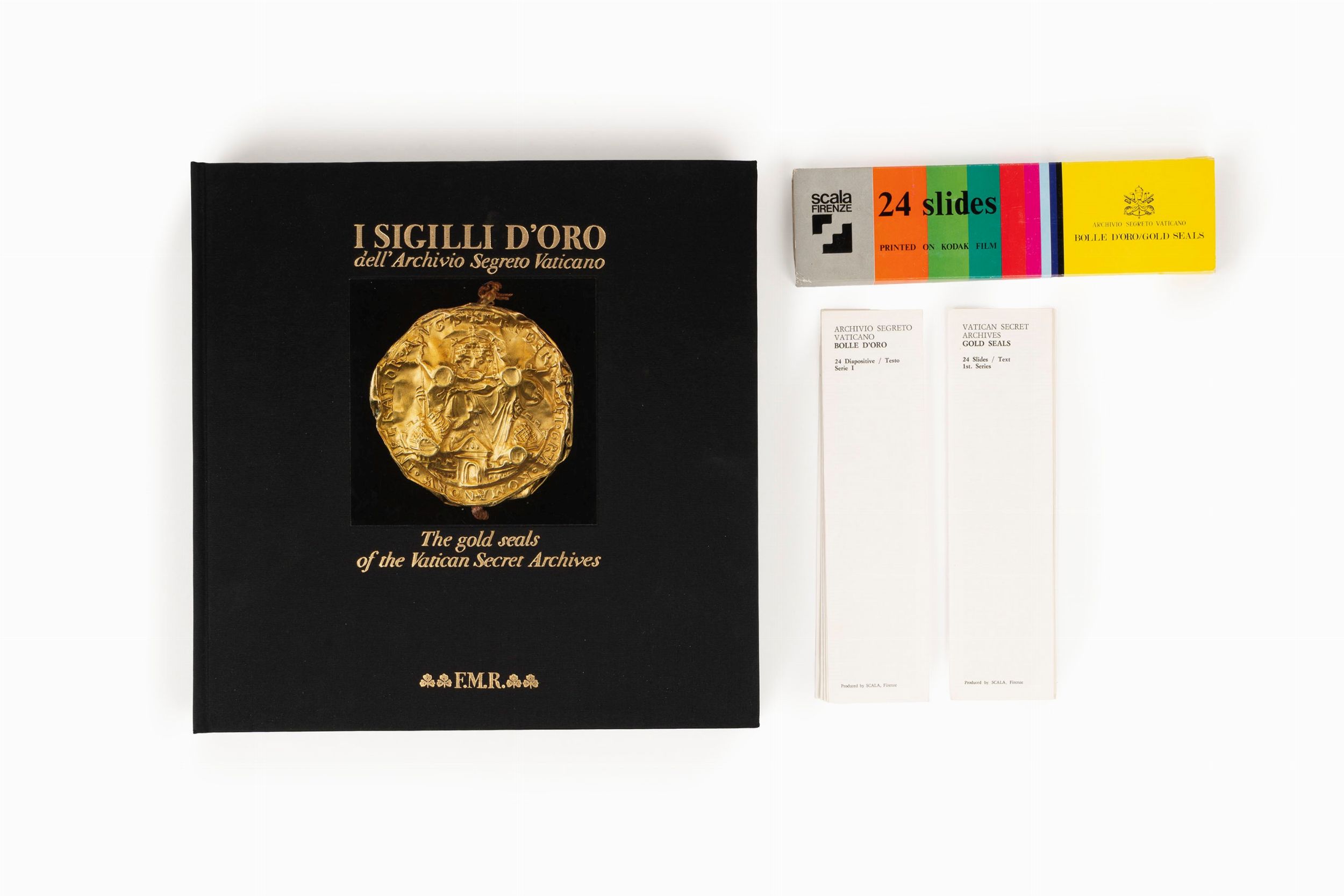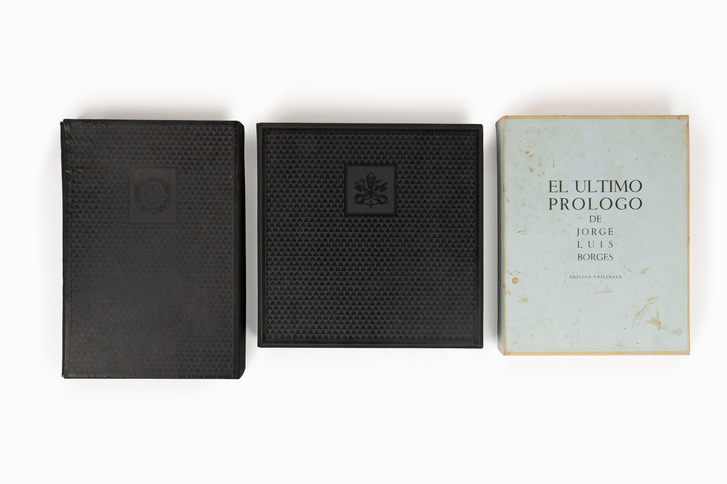 1982 Milano, Franco Maria Ricci, 1982. In 2°. Con numerose riproduzioni a colori su carta patinata di miniature della cosmologia tantrica applicate sulla carta, testo in spagnolo su carta azzurra, legatura editoriale in tela, al piatto illustrazione a colori, titoli in oro al piatto e al dorso, custodia editoriale in cartoncino, lievi difetti. Numero 148 di 4000 esemplari. § Insieme I Sigilli d'oro dell'Archivio Segreto del Vaticano, Milano, Franco Maria Ricci, 1984. In 4° grande. Con numerose illustrazioni a colori di sigilli in parte applicate e in parte stampate su carta azzurrina, legatura editoriale in seta nera, piatto con riproduzione fotografica a colori e titolo in oro, 24 diapositive contenute entro una scatola in cartone, custodia editoriale in cartoncino con dorso in tela. Esemplare 245 di 1000. § El Ultimo prologo de Jorge Luis Borges Edicion Trilingue , Buenos Aires, Franco Maria Ricci, 1990. In 2°. 3 volumi ciascuno in spagnolo, francese e inglese composti di fascicoli sciolti entro brossura in cartoncino con numerose illustrazioni a colori e in bianco e nero nel testo, custodia in cartoncino azzurro, diverse macchie.