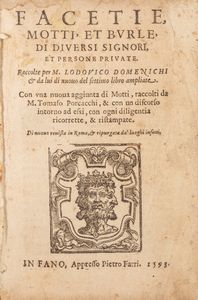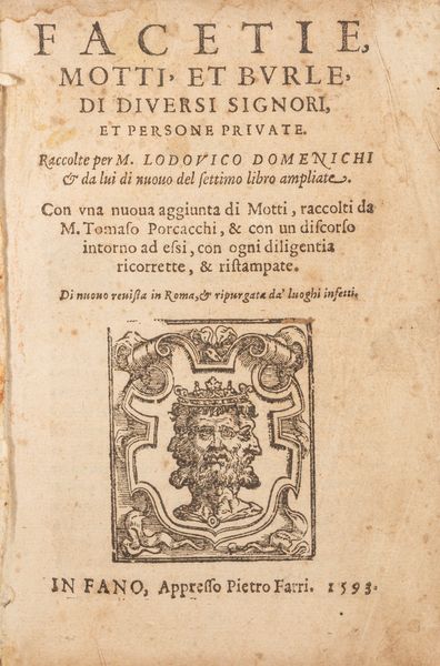1593 Fano, Pietro Farri, 1593. In 8°. Marca tipografica al frontespizio, lievi fioriture e arrossature, legatura coeva in pergamena, autore e titolo manoscritti al forso, allentata, lievi difetti.