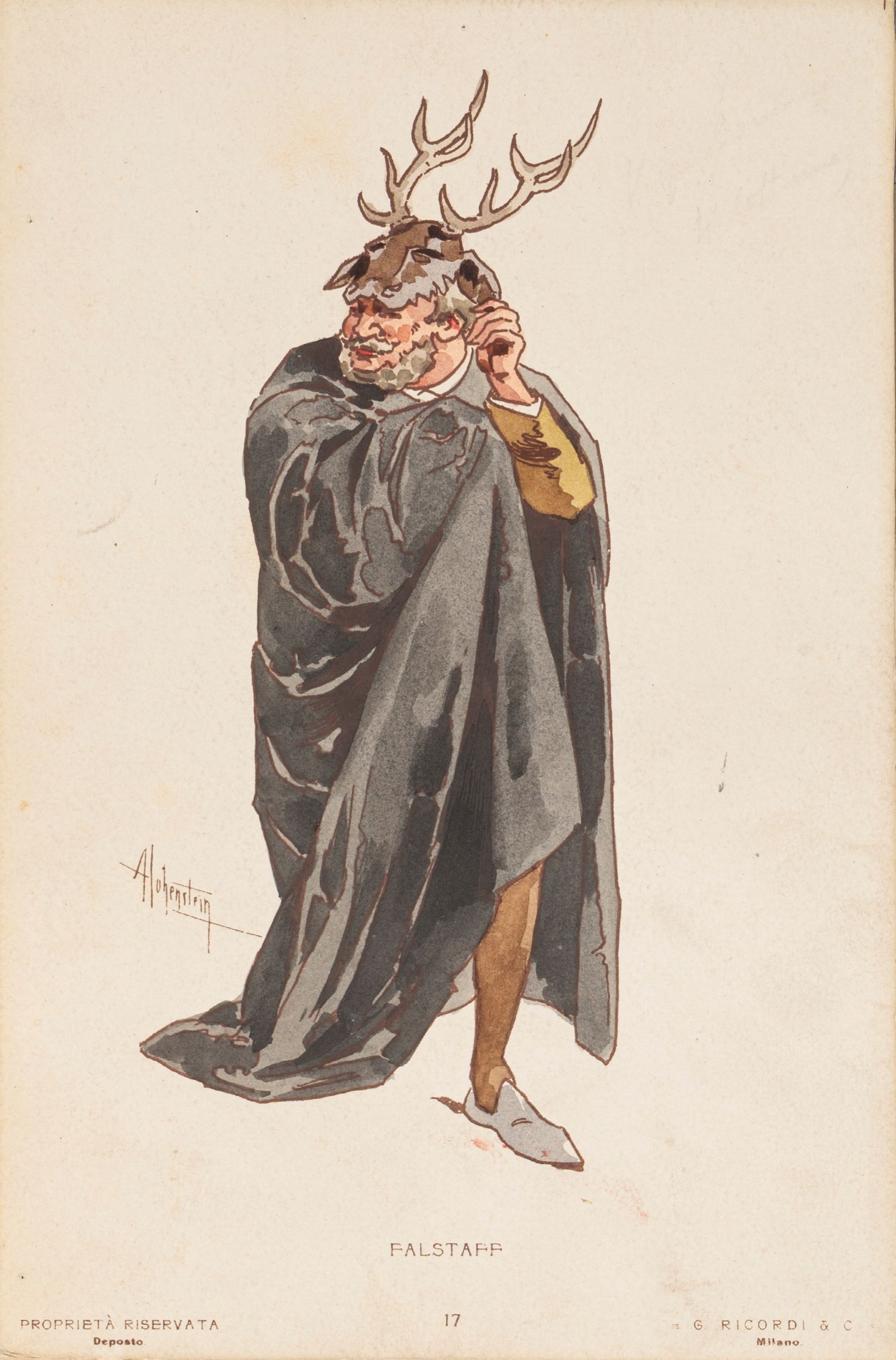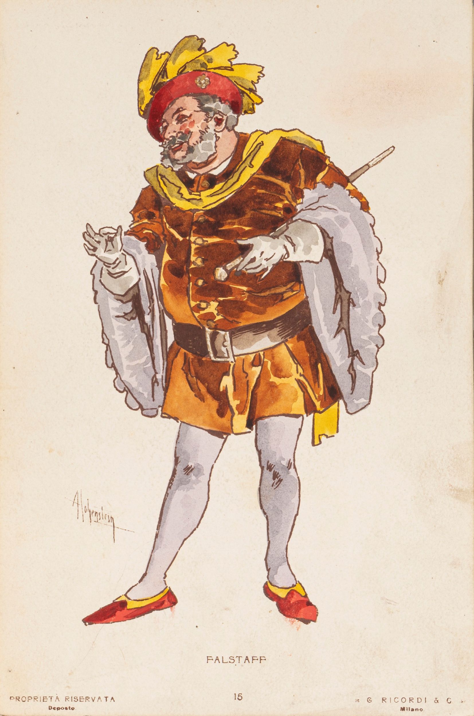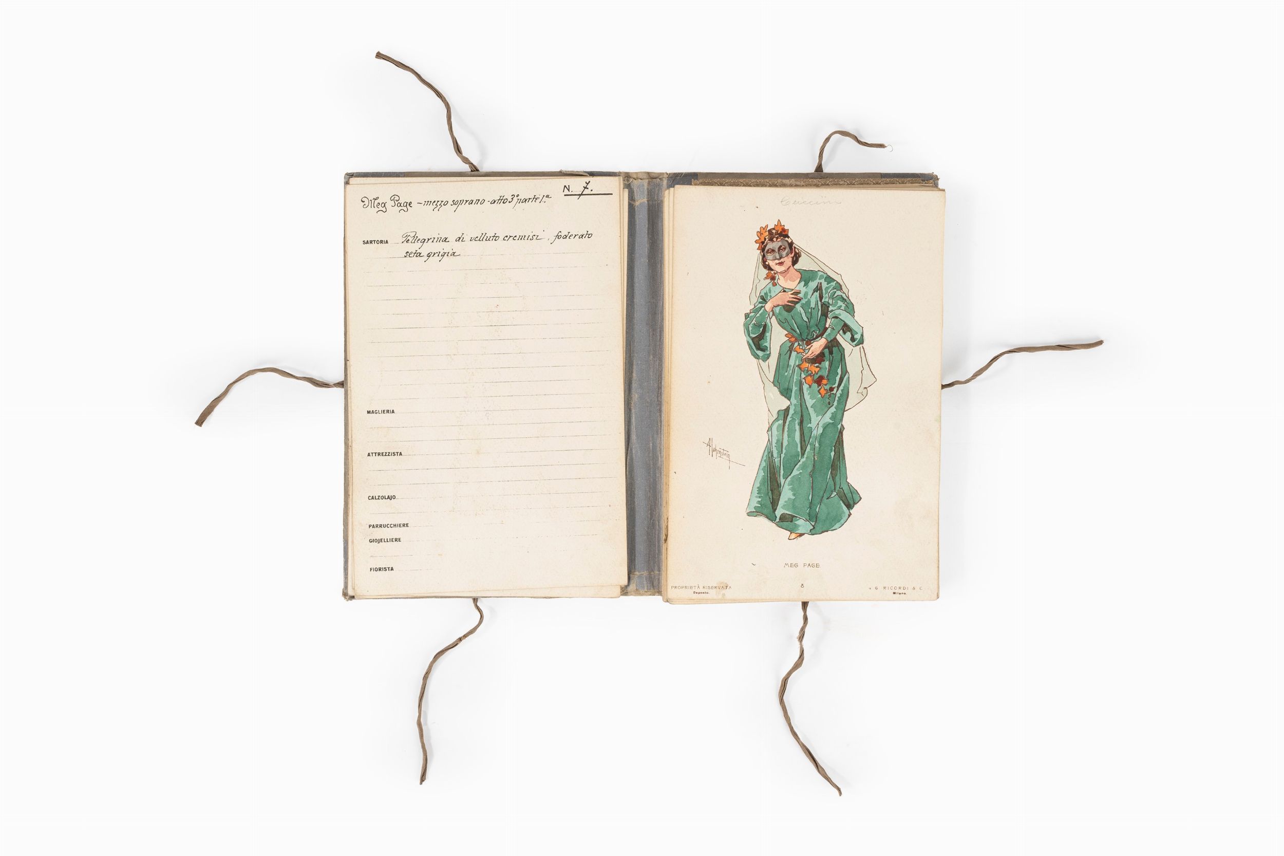 1893 Milano, Ricordi, [1893]. In 4°, 285 x 188 mm. Album in mezza tela tortora e cartone contenente 45 tavole rappresentanti figurini (41) e oggetti vari di scena, nonché calzature (4), incisioni acquarellate su cartoncino, al verso nome del personaggio, dettagliate istruzione per la sartoria, il calzolaio, il parrucchiere etc., lievi bruniture.