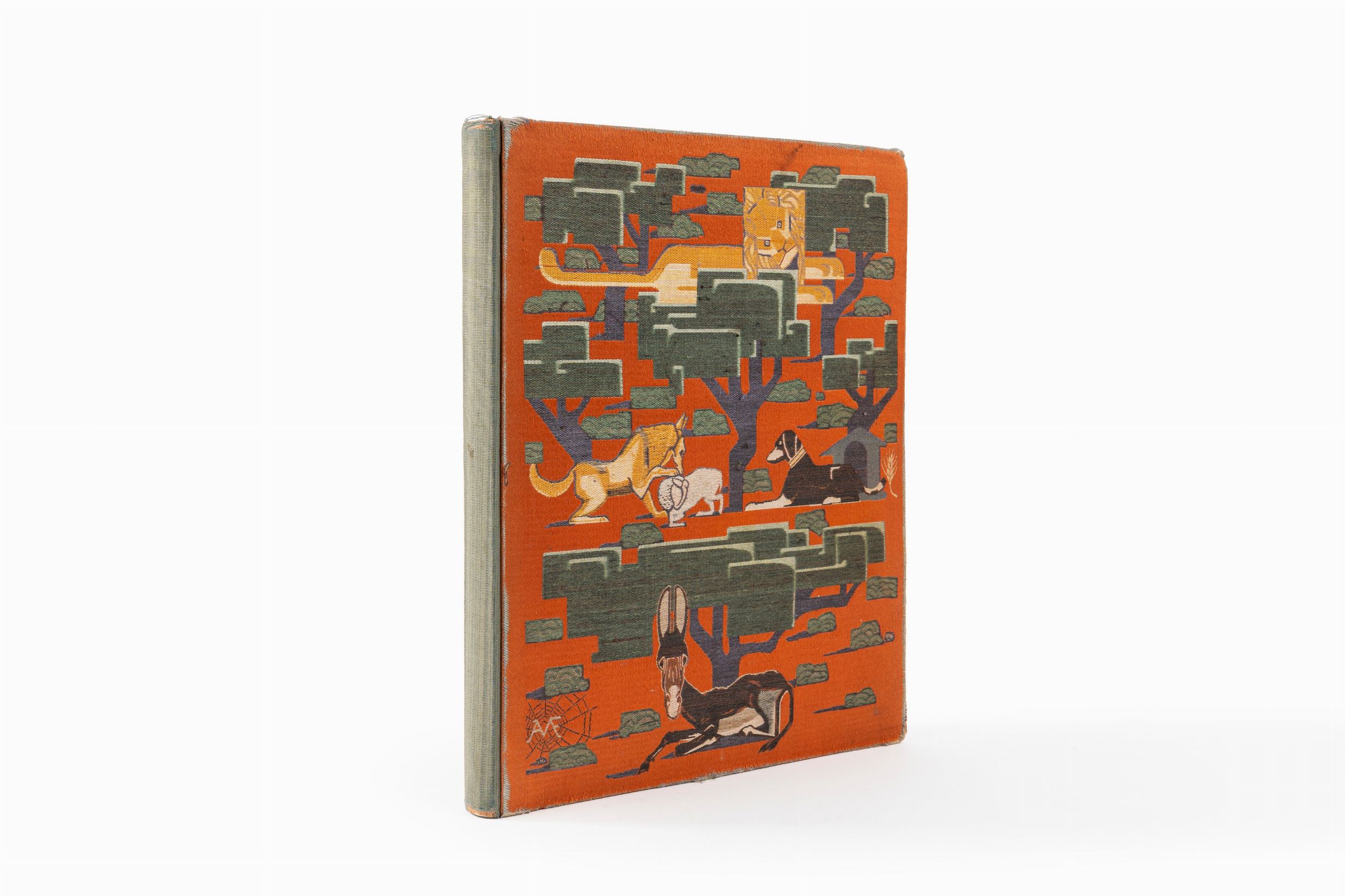 1920 Roma, Società Editrice di 'Novissima', 1920. In 2°. Opera completamente decorata da Duilio Cambellotti con numerose xilografie in bianco e nero e a colori nel testo e 30 tavole a piena pagina fuori testo monogrammate e protette da veline. Legatura editoriale in seta ricamata, piatto anteriore decorato con alberi e piante stilizzate ricamati in seta di diversi colori su fondo arancione, monogramma AMVF nella ragnatela nell'angolo in basso a sinistra. Mancante il cofanetto, esemplare liso con mancanze negli angoli e al dorso. Qualche sporadica macchia, strappi in alcune veline di protezione.