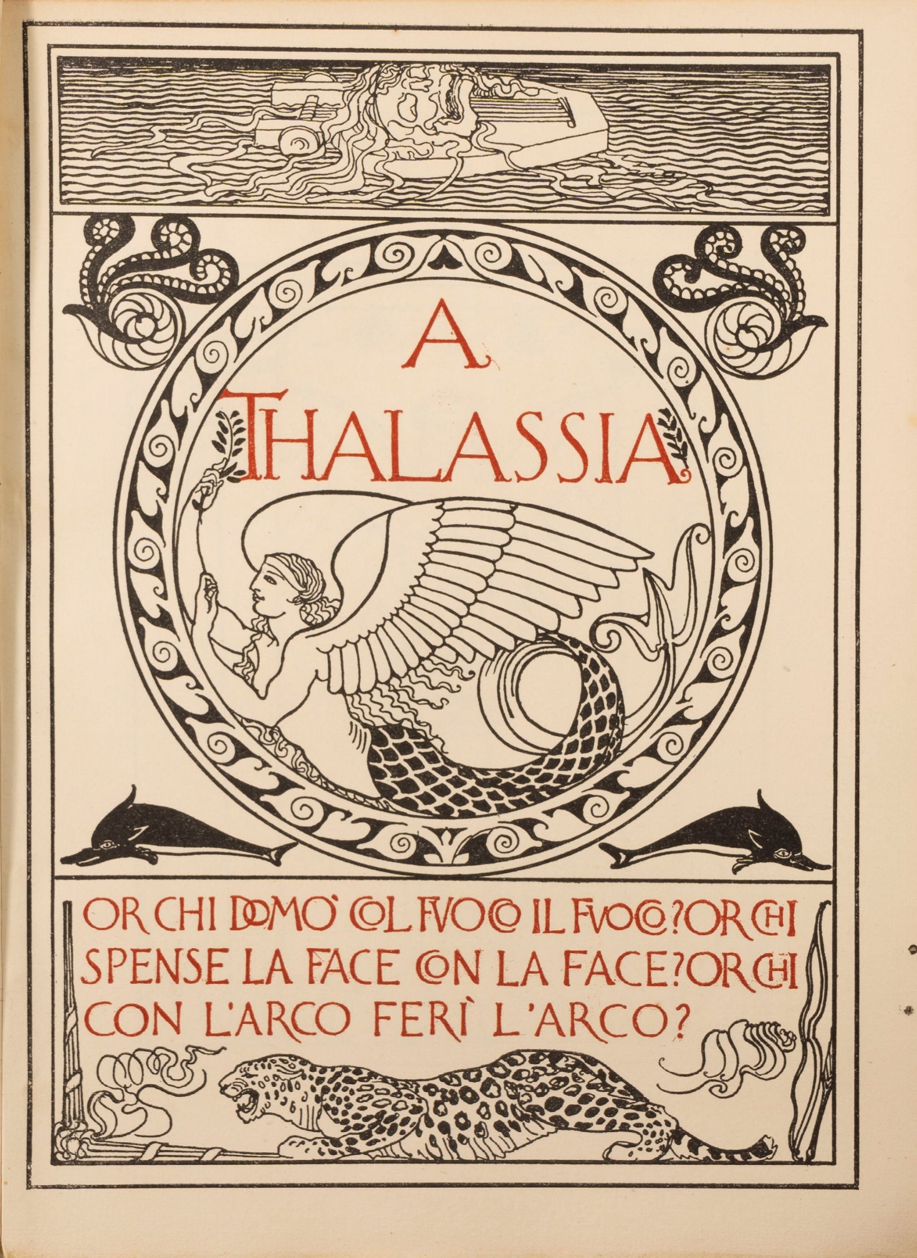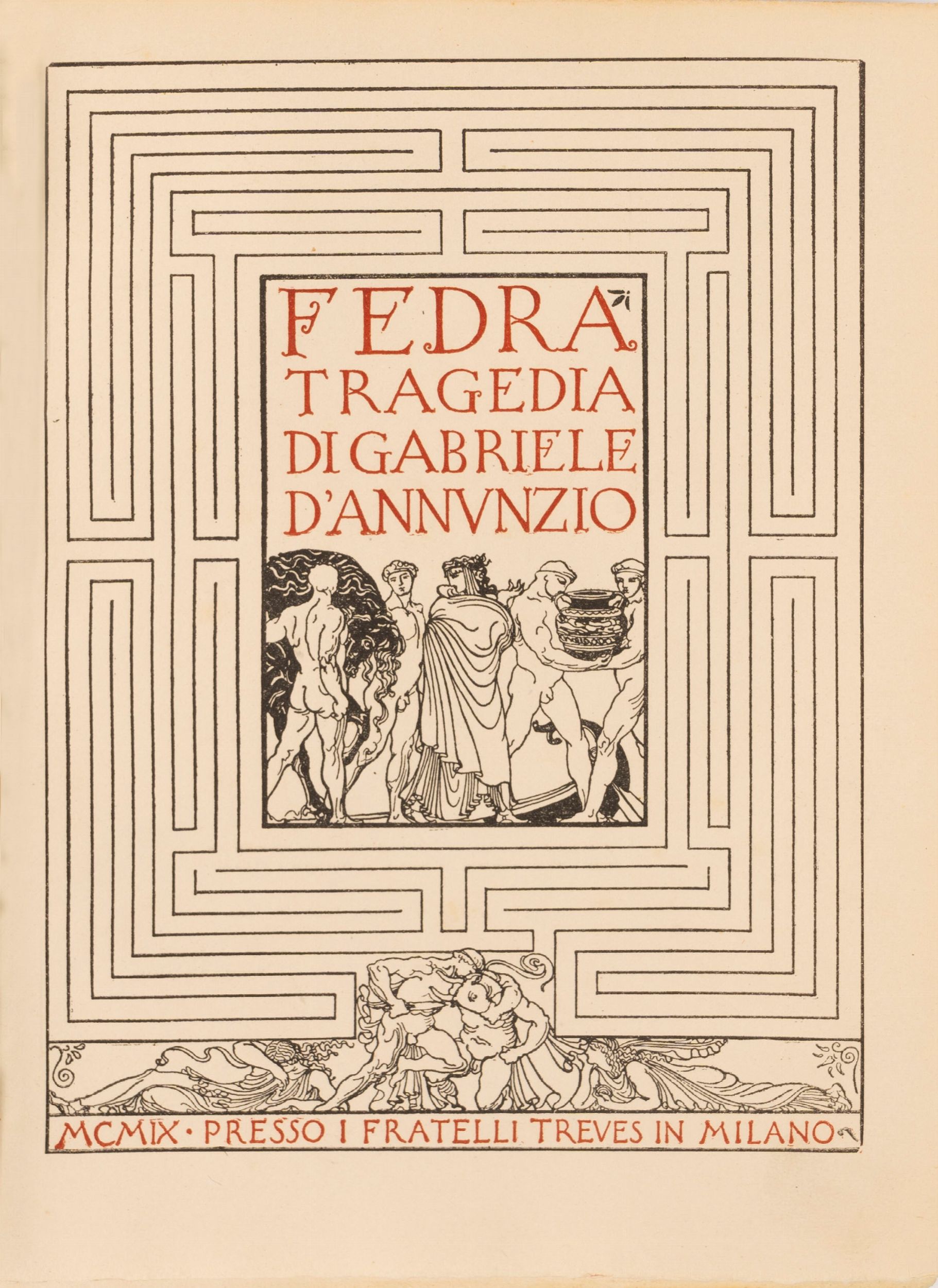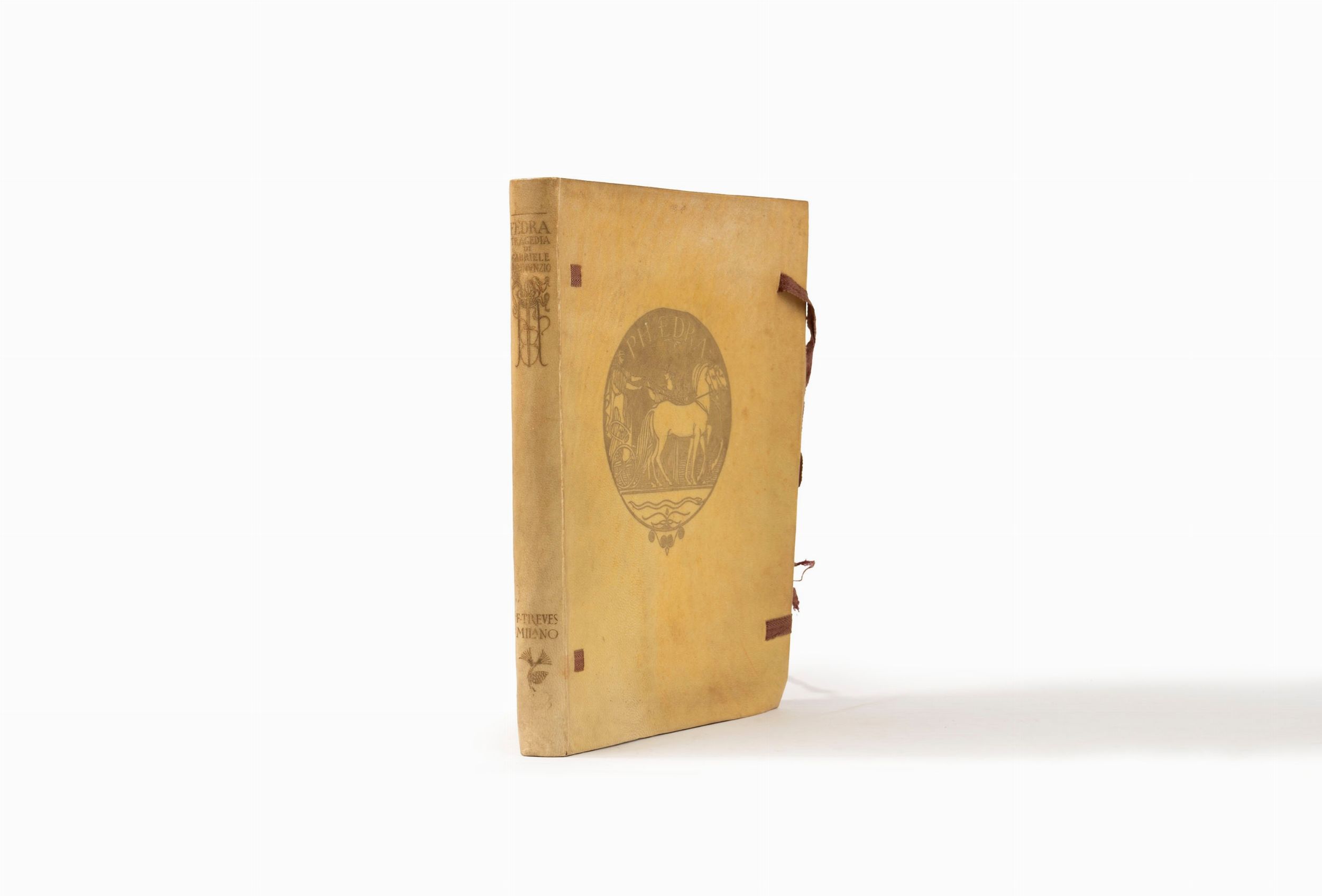 1909 Milano, Fratelli Treves, 1909. In 8°. Legatura editoriale in piena pergamena con bindelle in stoffa, titolo in oro al dorso, medaglione impresso in oro al piatto anteriore. Xilografie di Adolfo De Carolis. Esemplare stampato su carta forte.