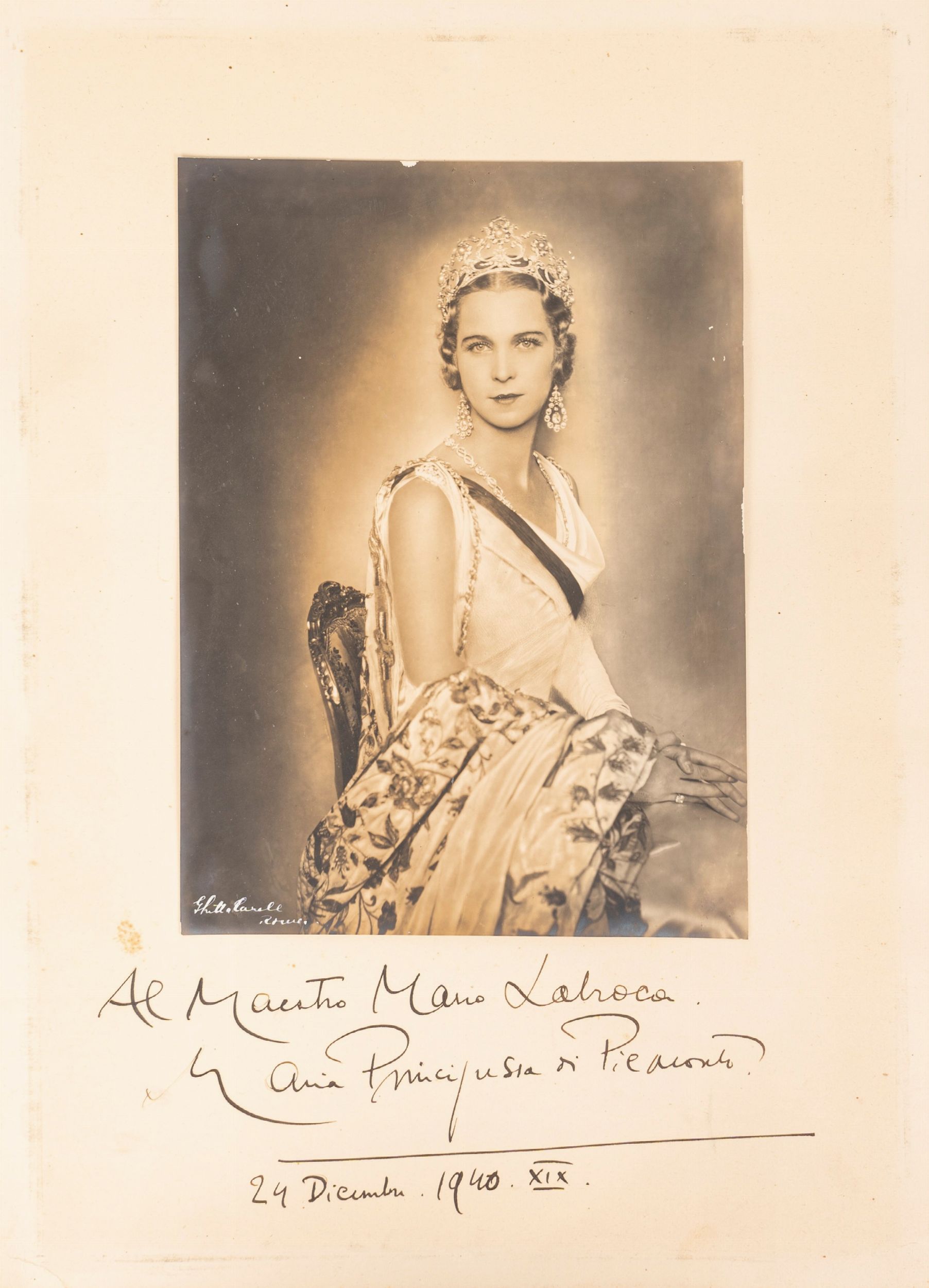 1940 Bella foto autografata (stampa vintage alla gelatina d'argento) firmata in basso a sinistra da Ghitta Carell, 256 x 165 mm., applicata su cartone avorio con dedica in basso 'Al Maestro Mario Labroca Maria Principessa di Piemonte 24 Dicembre 1940 - XIX', lievi difetti ai margini.