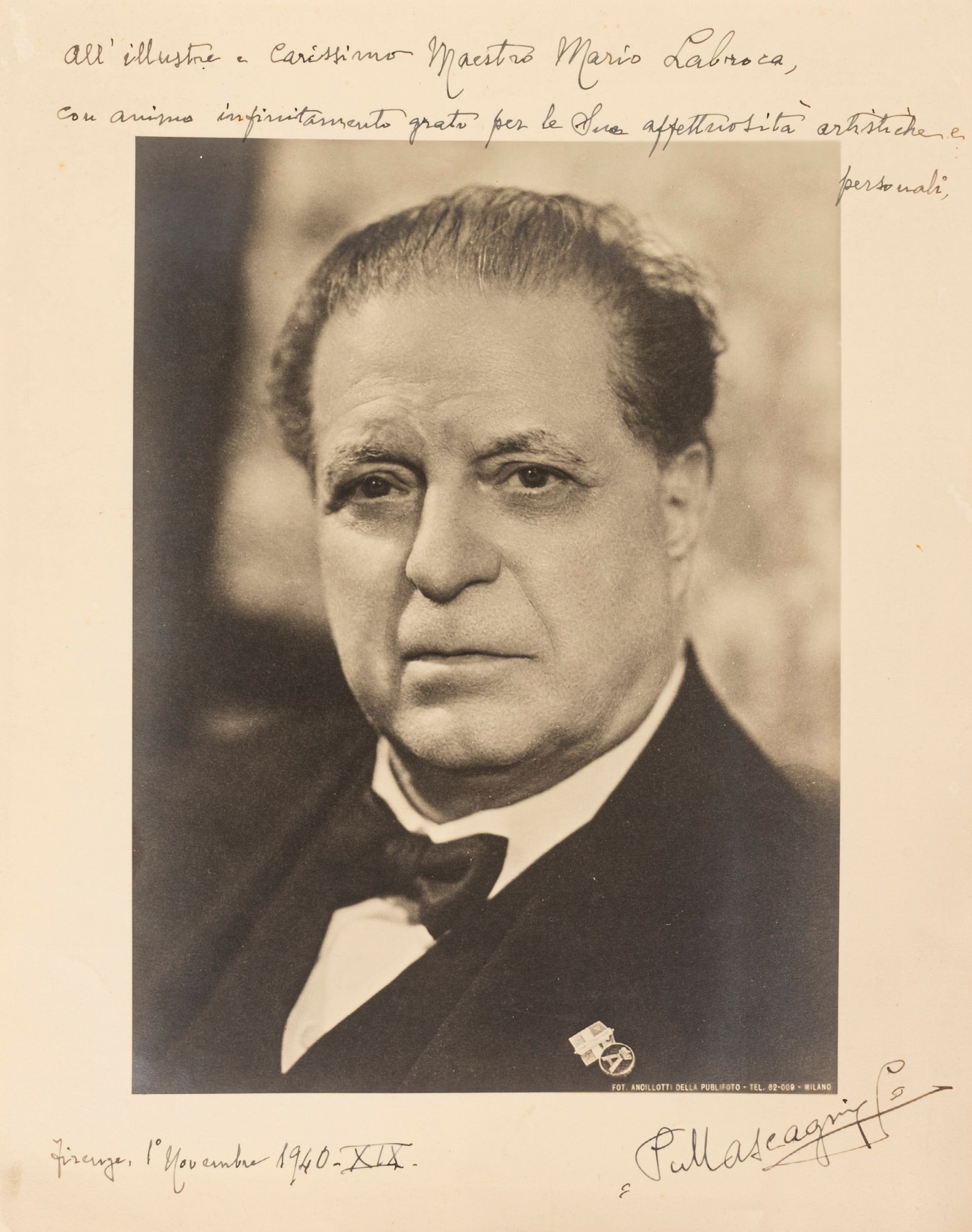 1940 Bella foto con dedica di grande formato, 292 x 231 mm., 'All'illustre e carissimo Maestro Mario Labroca con animo infinitamente grato per le Sue affettuosità artistiche e personali. Firenze, 1° Novembre 1940 XIX. P Mascagni.'