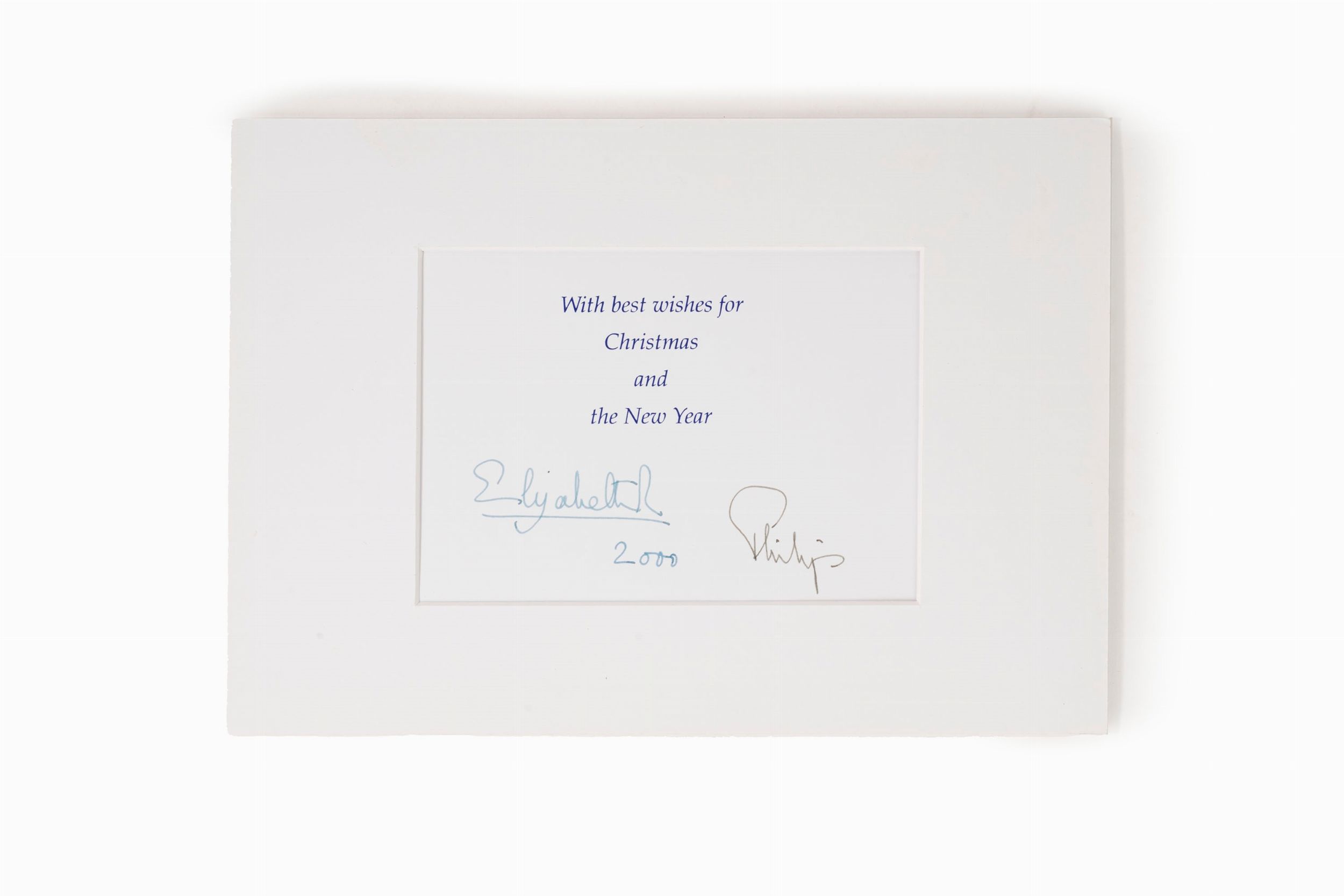2000 Fotografia (mm 113 x 162) montata su passepartout assieme a un cartoncino di auguri natalizi con autografo della Regina Elisabetta II del Regno Unito, che appone insieme alla sua firma l'anno '2000', e autografo del principe Filippo.