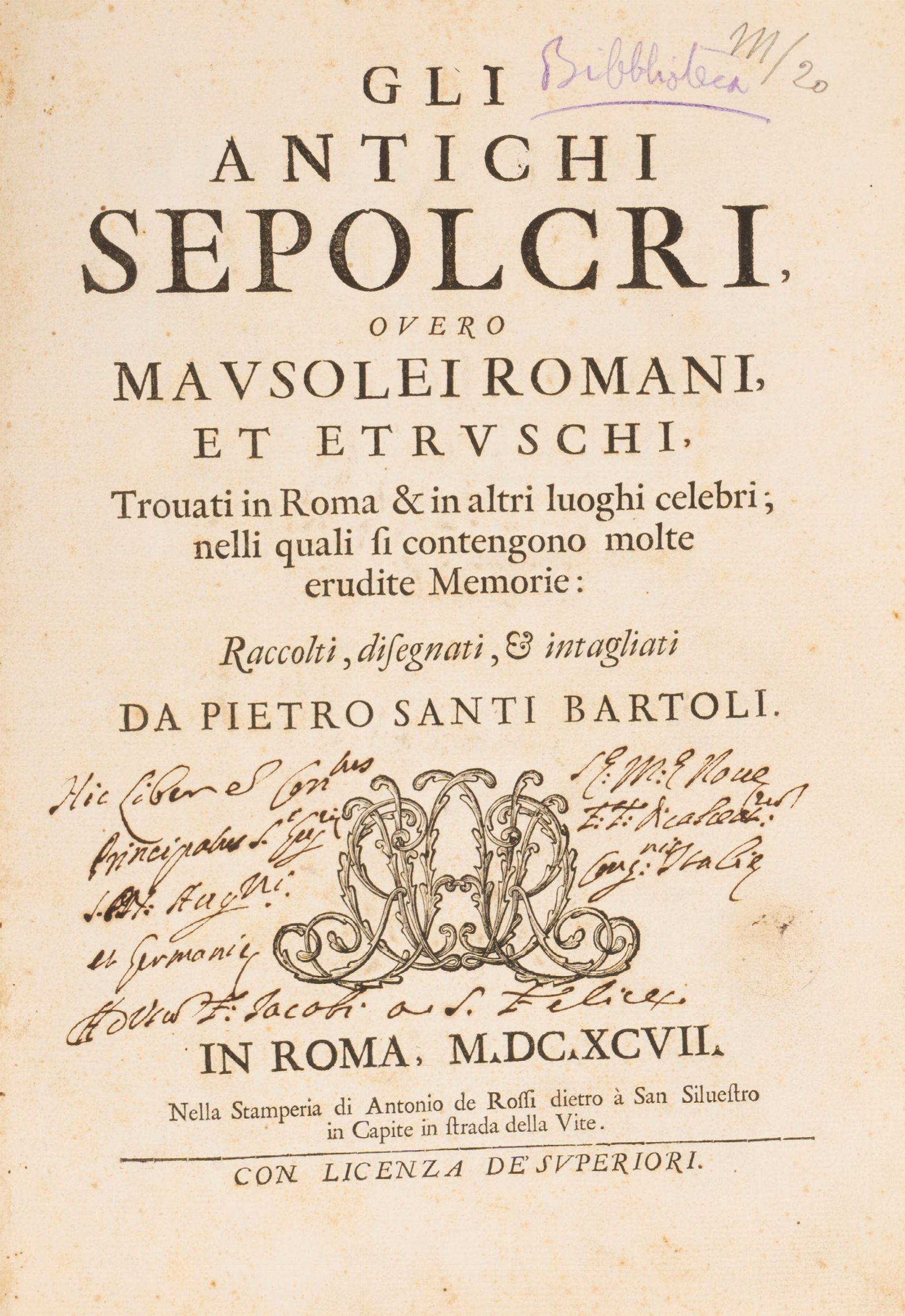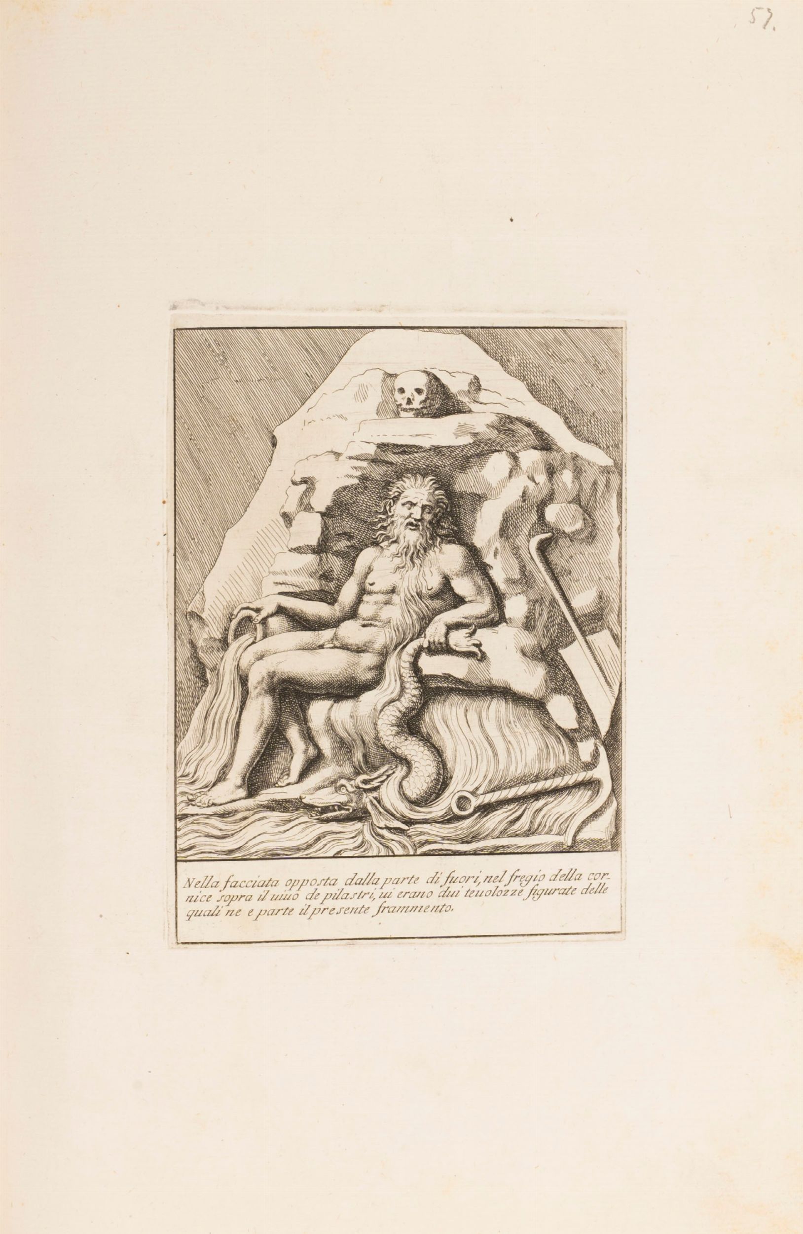 1697 Roma, Antonio de Rossi, 1697. In 2°. Con 103 (di 114) tavole finemente incise all'acquaforte, lievi fioriture marginali, alcuni fascicoli leggermente allentati, legatura coeva in mezza pergamena rigida, al dorso liscio tassello in pelle rossa con titolo in oro, lievi difetti. Firma di appartenenza al frontespizio