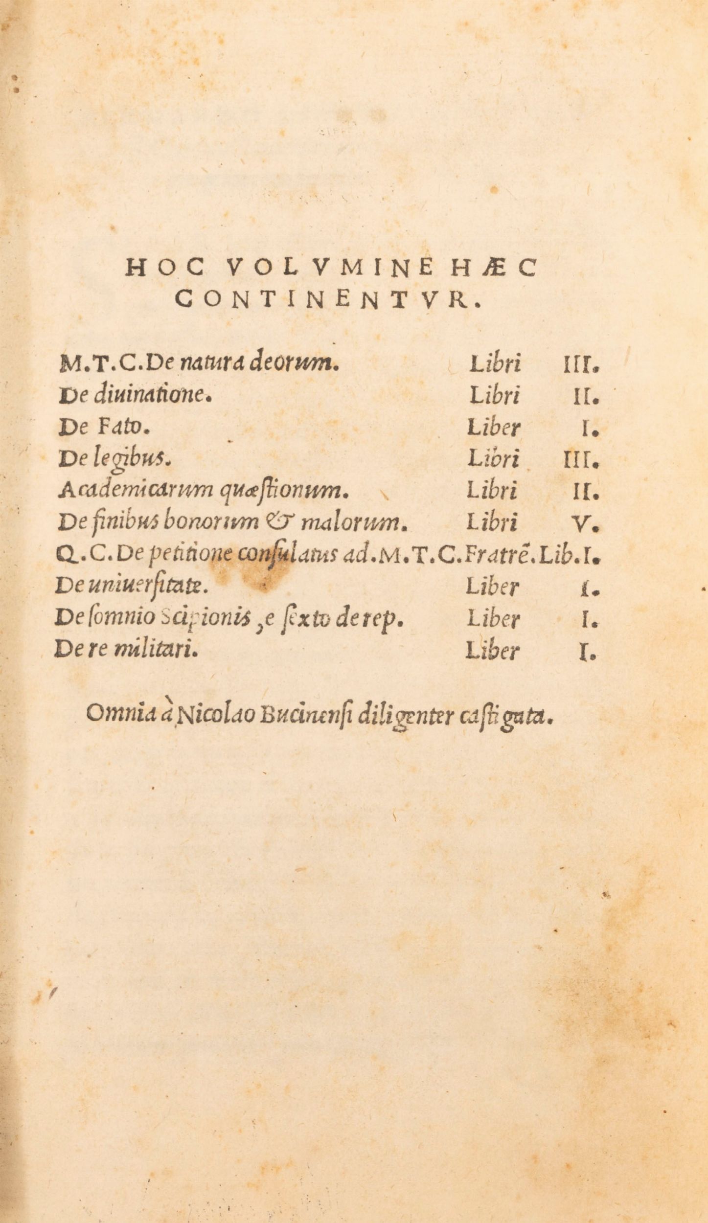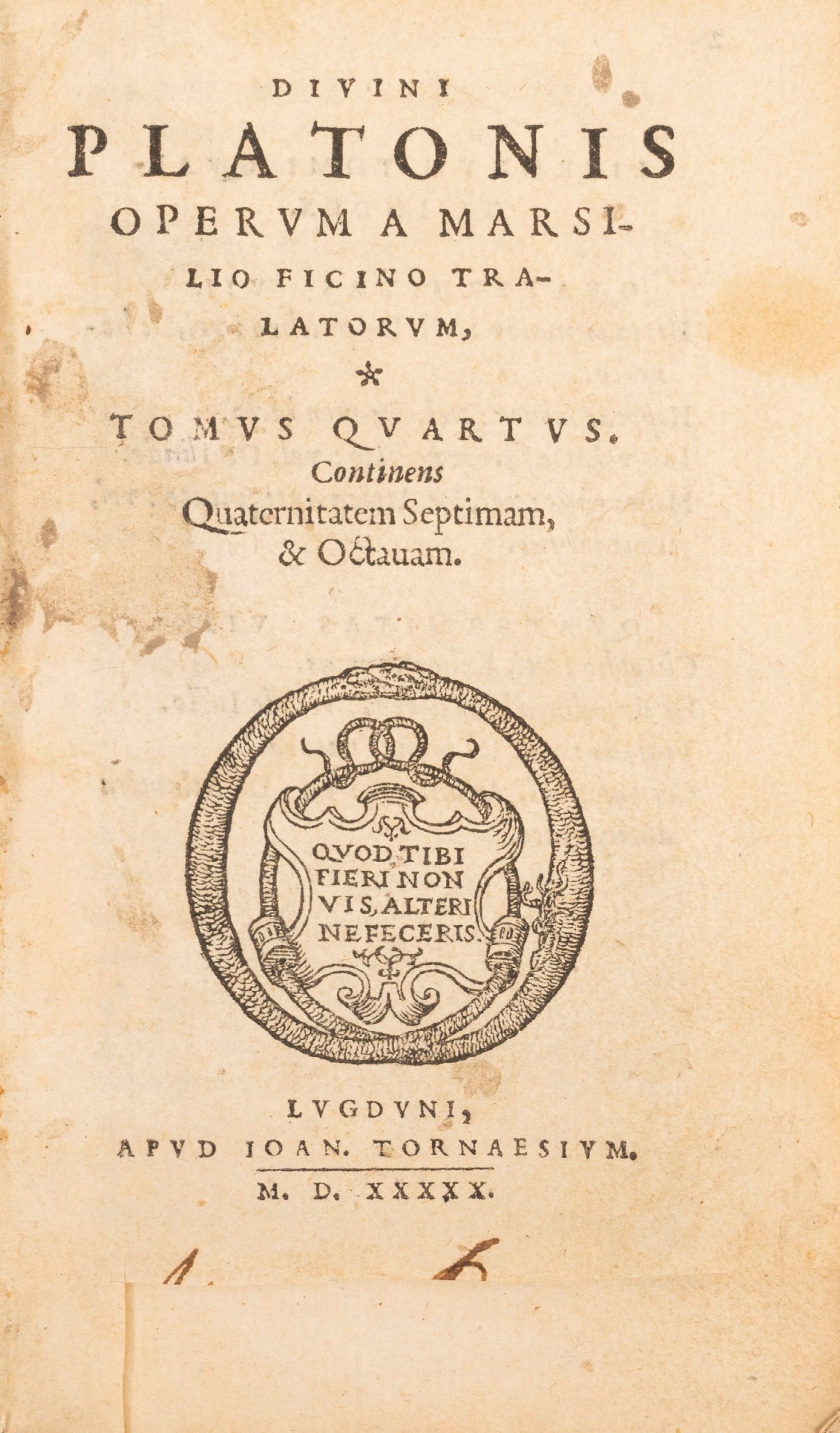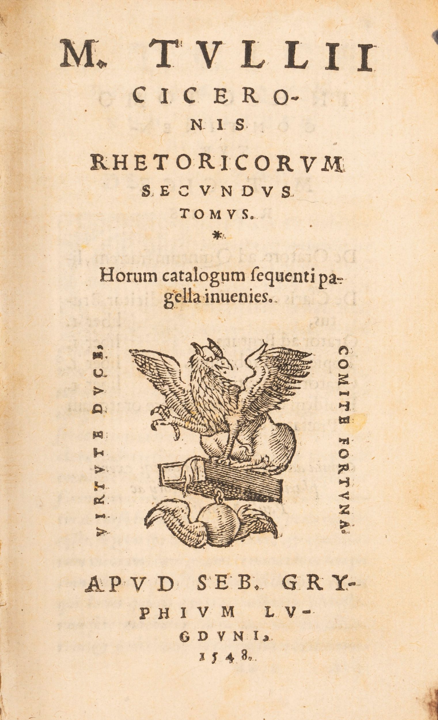 1516 Firenze, Filippo Giunti, 1516. In 8°. Qualche lieve traccia di umidità e arrossatura, legatura coeva in pergmena, tagli a spruzzo blu, lievi difetti. § Cicerone, Marco Tullio. Orationum volumen primum . Lione, Antonio Grifo, 1571. In 12°. Solo volume primo. Grifone al frontespizio, leggera brunitura, restauri al frontespizio, legatura in pelle, titoli in oro al dorso, lievi difetti. Ex libris al contropiatto. § Cicerone, Marco Tullio, Rhetoricorum , secundus tomus. Lione, Grifo, 1548. Solo tomo II. In 12°. Grifone inciso in legno al frontespizio, lieve traccia di umidità su pochi fascicoli, legatura coeva in pergamena, autore e titolo manoscritti al dorso a 3 nervi, lievi difetti. Ex libris cartaceo al contropiatto. § Divini Platonis Operum a Marsilio Ficino tralatorum , Lione, J. de Tournes,1550. In 12°. Solo tomo 4. Marca al frontespizio e in fine, leggera brunitura, rari e piccoli fori di tarlo, mancanza al margine inferiore del frontespizio, legatura coeva in pergamena, titolo manoscritto al dorso e al taglio inferiore,