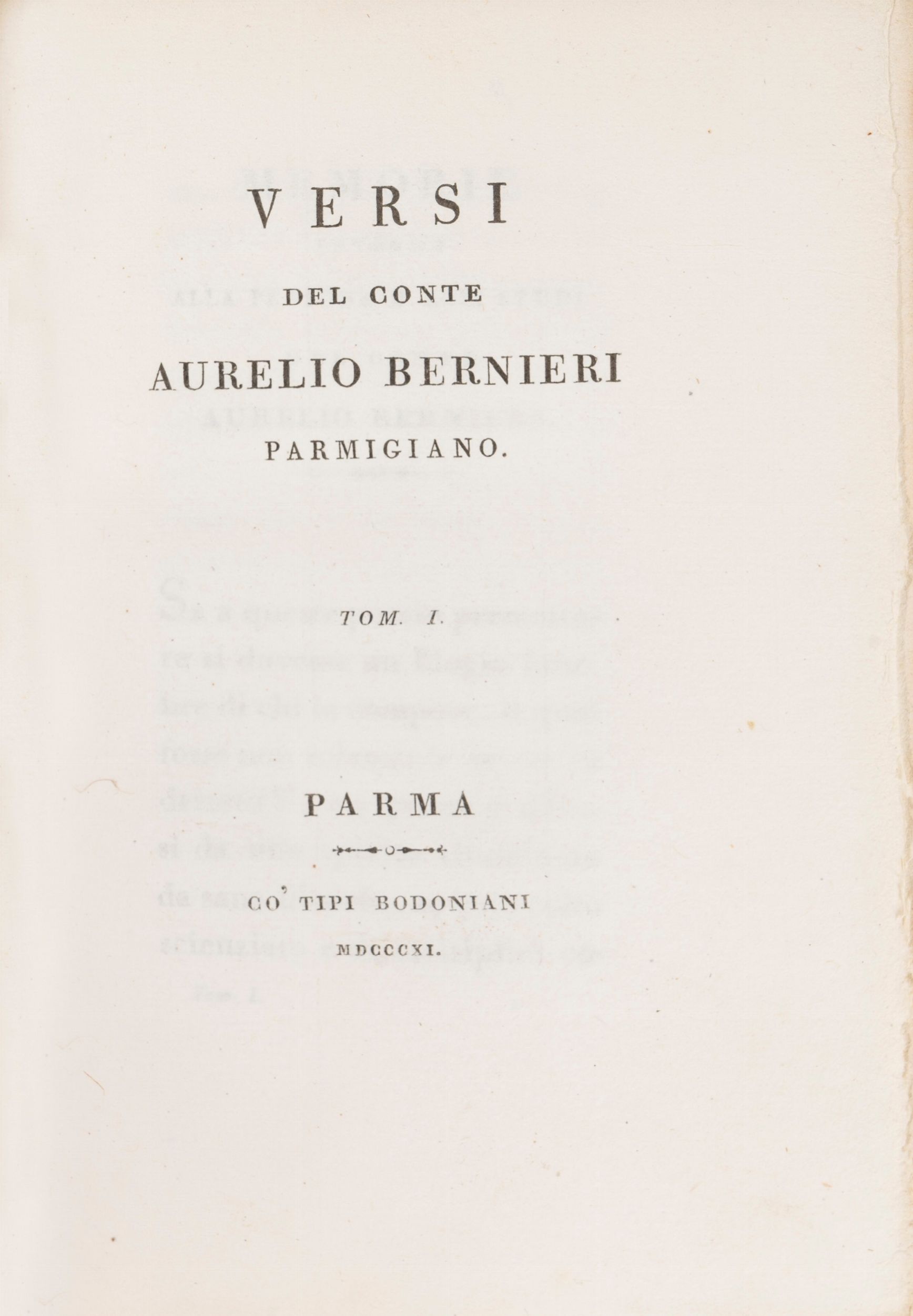 1800 Parma, co' Tipi Bodoniani, 1800. In 4°. Legatura in cartonato, difetti al dorso e ai piatti. § Aurelio Bernieri, Versi . Parma, co' Tipi Bodoniani, 1811. In 8°. Tre volumi legati in un unico tomo. Piccolo alone di umidità all'ultimo foglio. Legatura dell'Ottocento in marocchino marrone, dorso a 4 scomparti, con nome dell'autore in oro, cerniere sciupate. Esemplare in barbe.