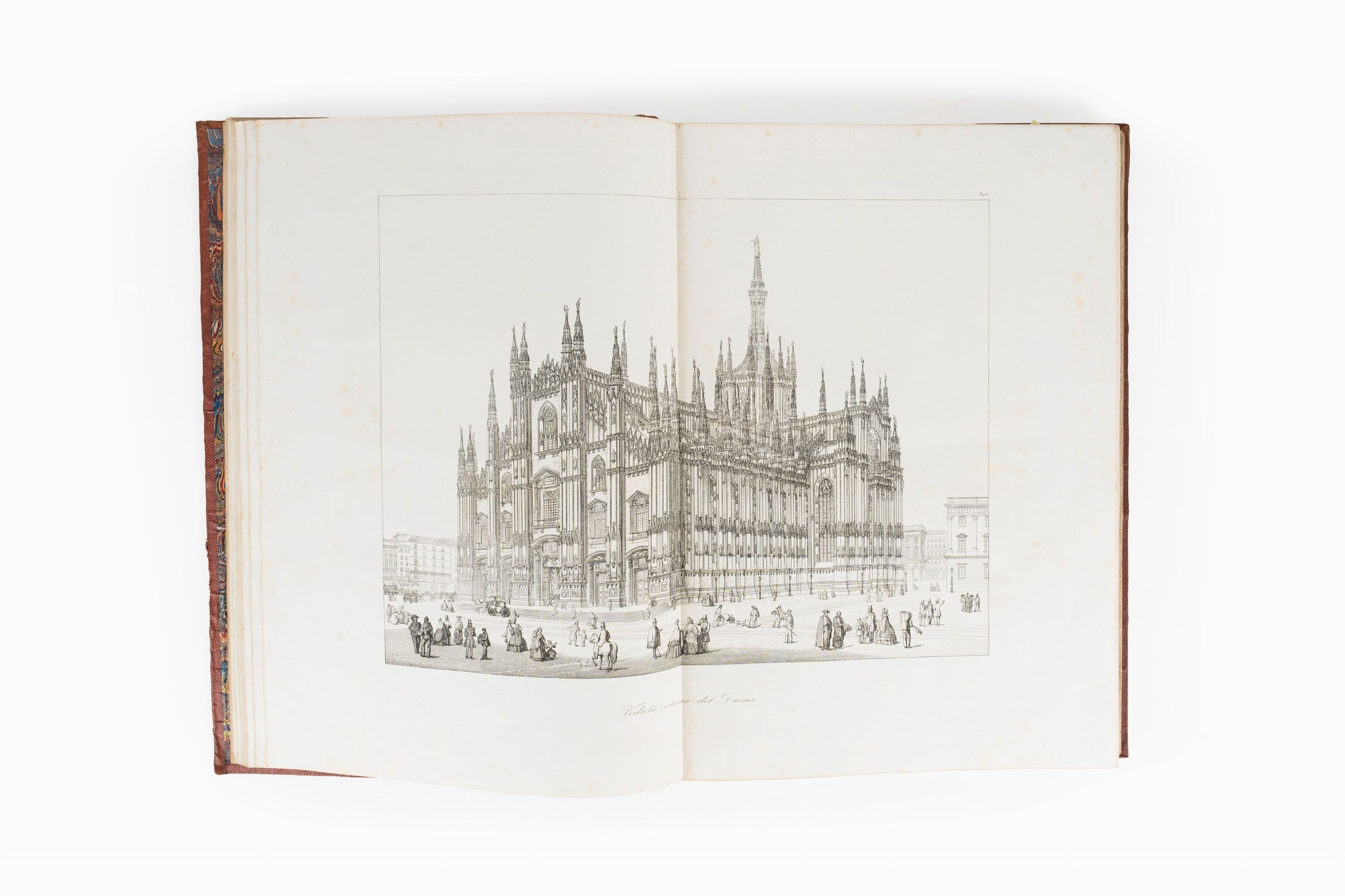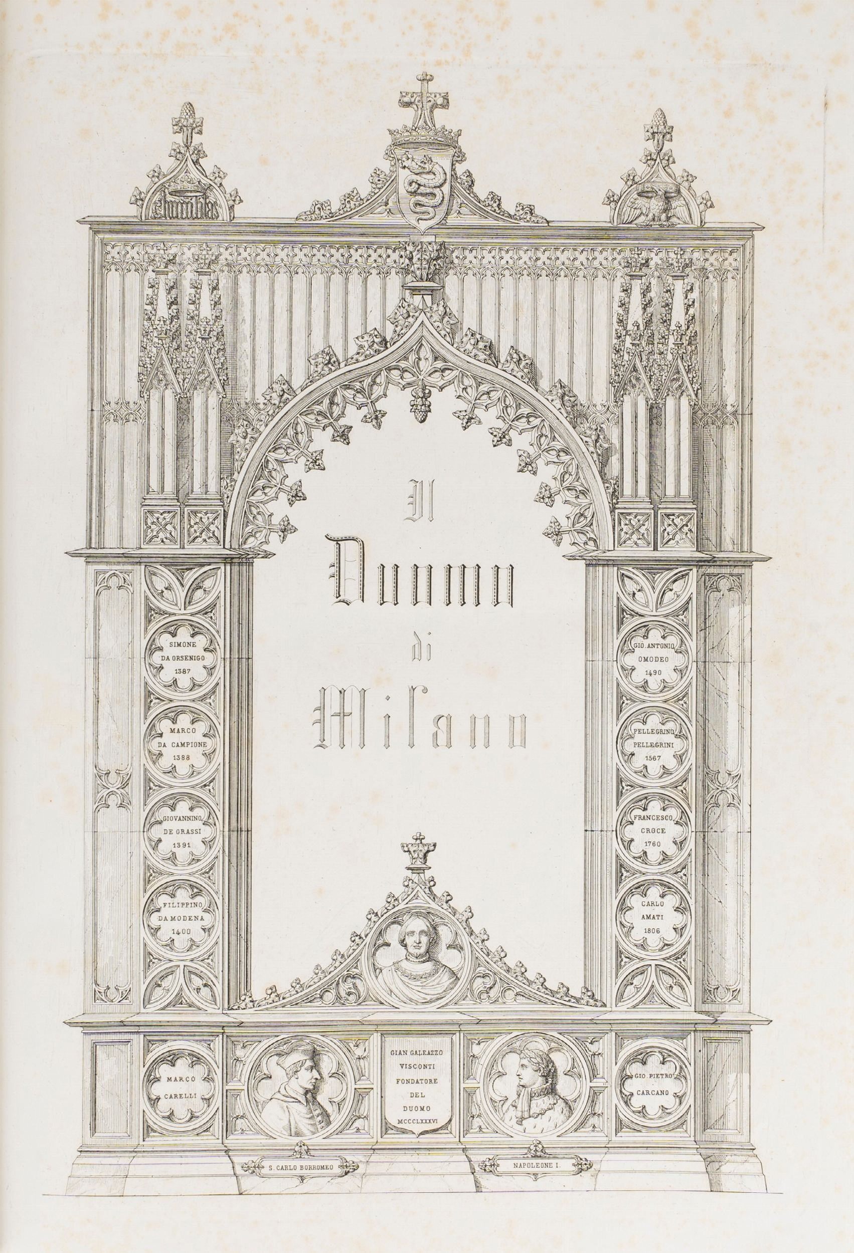 1871 Como, Tipografia Provinciale Felice Ostinelli, 1871. In 2°, 470 x 340 mm. Frontespizio figurato con i nomi dei principali architetti e tre ritratti in medaglione (Gian Galeazzo Visconti, San Carlo Borromeo, Napoleone I), accurata storia del Duomo di Milano seguita dalla descrizione della tavole, 64 bellissime tavole architettoniche 35 delle quali sono a doppia pagina, le incisioni mostrano mappe, dettagli architettonici, vedute esterne, pitture ecc., lievi marginali fioriture, legatura in chagrin rosso con al piatto impresso in oro la figura del Duomo, sciupata.
