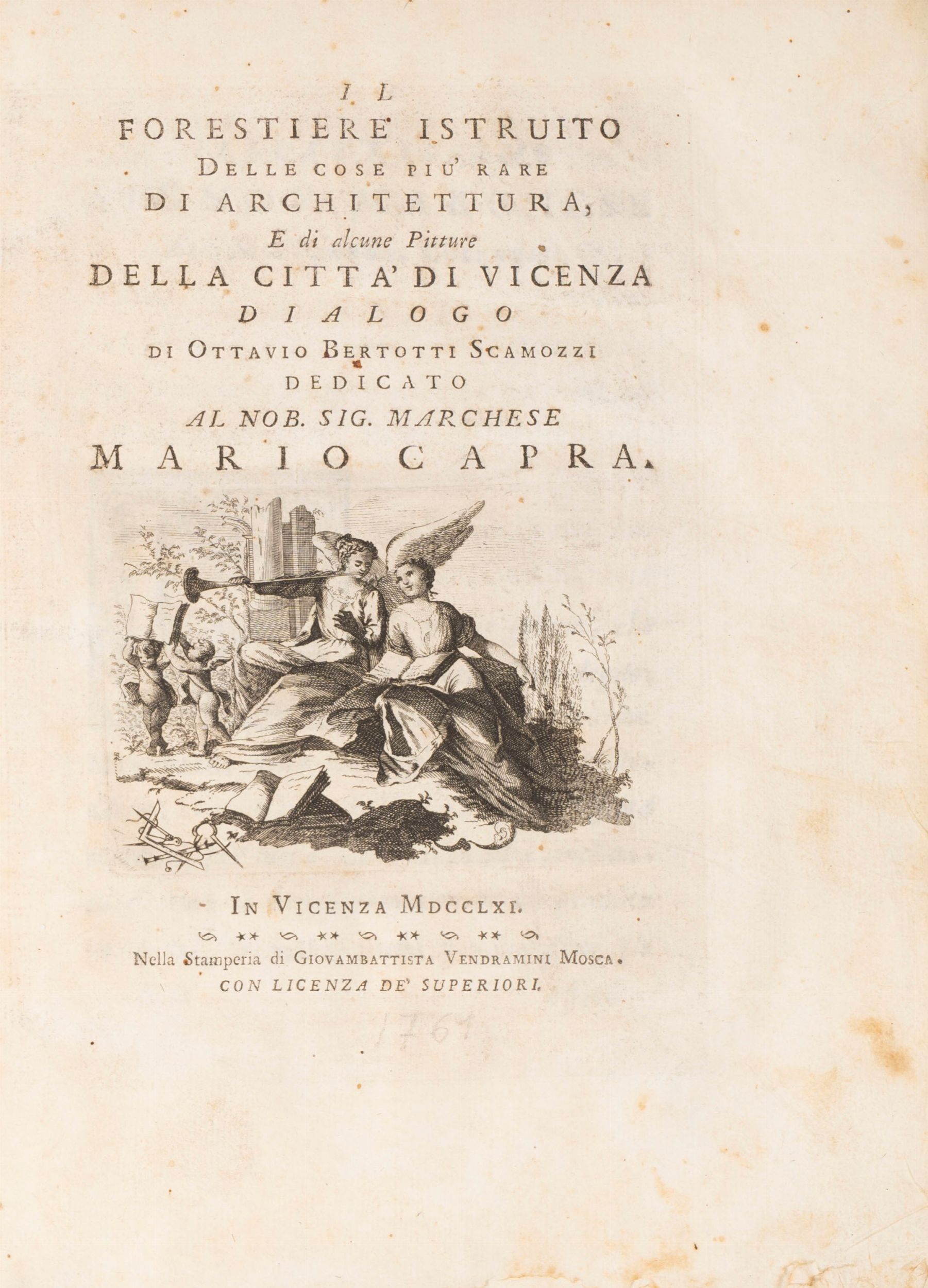 1761 Vicenza, Giovambattista Vendramini Mosca, 1761. In 4°. Ritratto del marchese Mario Capra inciso in rame all'antiporta, tavole calcografiche fuori testo di Cristoforo Dall'Acqua, capilettera, testatine e finalini xilografici. Ex libris cartaceo al contropiatto.