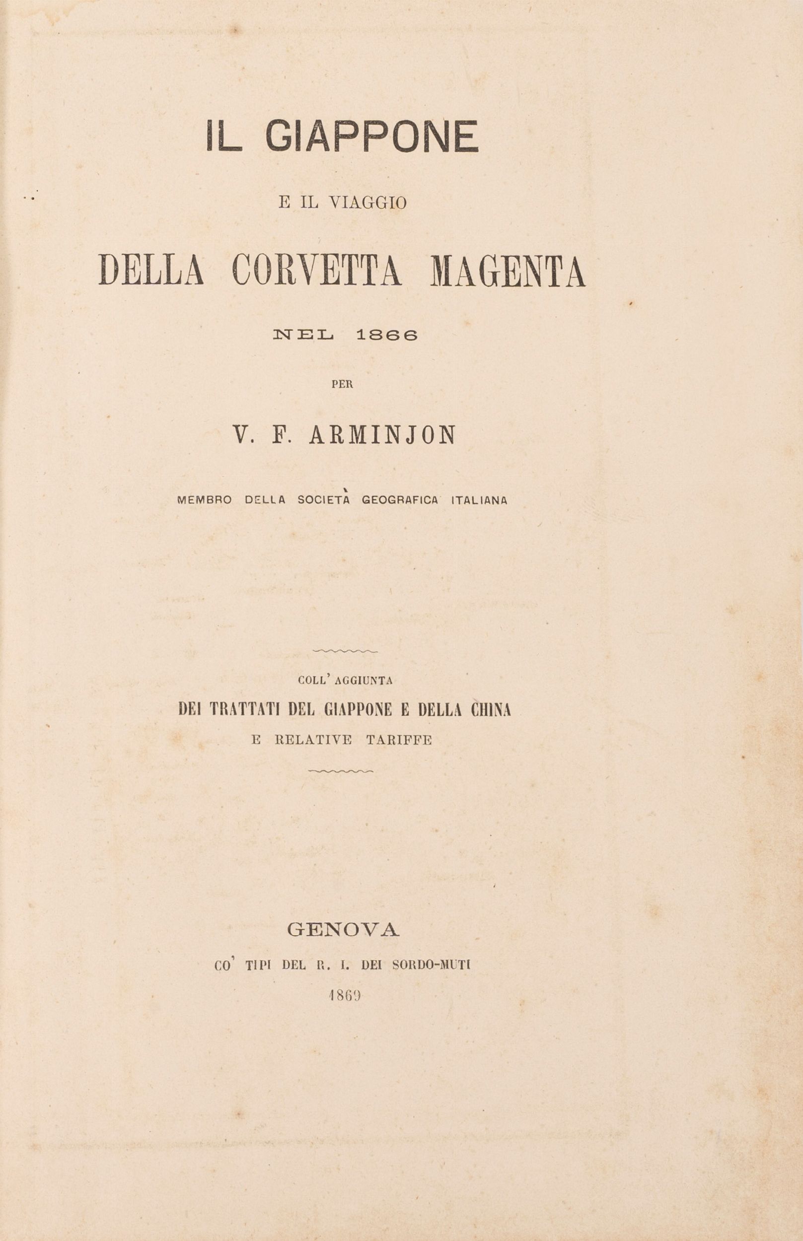 1869 Genova, co' tipi del R.I. dei sordo-muti, 1869. In 8°. In fine al volume tabelle con tariffe, tavola ripiegata con la carta del Giappone con mancanza, lievissima brunitura, qualche rara fioritura alle prime carte, legatura editoriale in cartoncino blu, titolo in oro a dorso, lievissimi difetti.